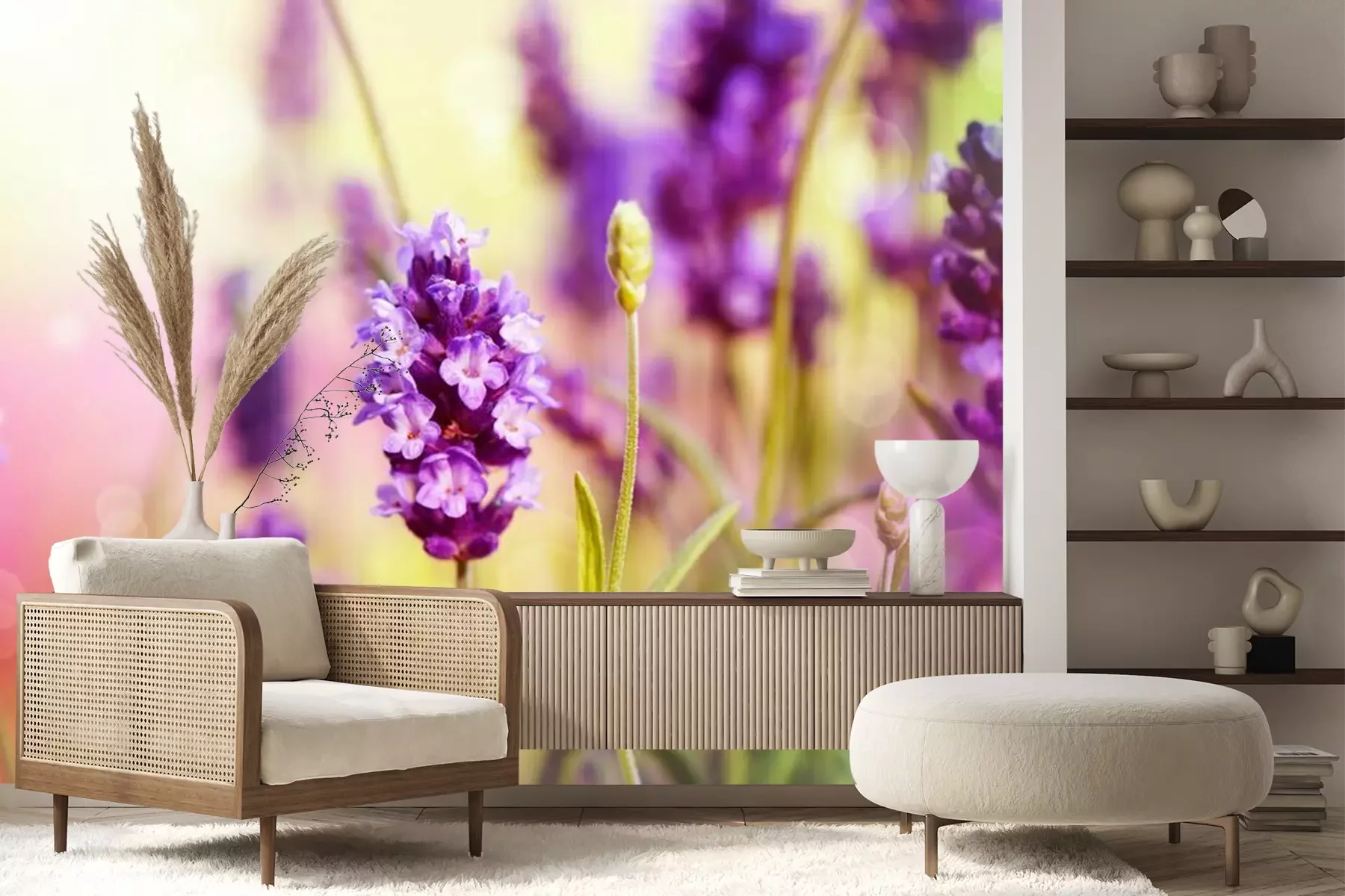 Het materiaal Premium+ is een gestructureerd vinyl op vlies met een gewicht van 255 g/m², dat kleine oneffenheden in de muur effectief camoufleert. De subtiele structuur van fijn zand geeft het oppervlak een exclusieve uitstraling, terwijl de halfmatte afwerking de diepte van de kleuren benadrukt. Het materiaal is dampdoorlatend, waardoor het ook in de keuken en badkamer kan worden gebruikt. De maximale breedte van één baan bedraagt 100 cm – bij grotere afmetingen wordt het fotobehang in meerdere gelijke banen verdeeld. De lijm wordt direct op de muur aangebracht en het behang wordt rand-aan-rand geplakt, wat zorgt voor een esthetisch resultaat zonder zichtbare naden. Het oppervlak kan gemakkelijk worden schoongemaakt door het voorzichtig af te nemen met een vochtige doek.