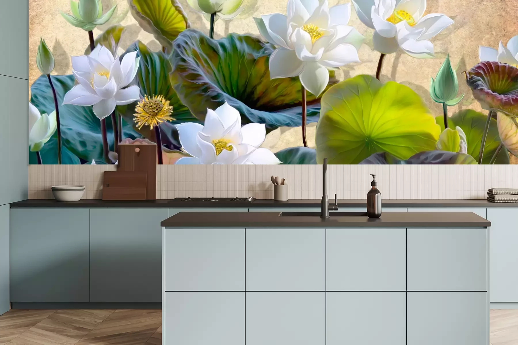 Het materiaal Premium is een glad vinyl op vlies, dat bestand is tegen uitrekken en vervorming. Het is dampdoorlatend – de muren kunnen vrij ademen – waardoor het geschikt is voor gebruik in de keuken en badkamer. Bij vervuiling kan het materiaal worden afgenomen met een vochtige doek. De maximale breedte van één baan bedraagt 95 of 105 cm, afhankelijk van de beschikbaarheid. Montage vindt plaats met de rand-aan-rand methode, wat een esthetisch resultaat zonder zichtbare naden oplevert. Omdat de lijm rechtstreeks op de muur wordt aangebracht, verloopt de installatie van het fotobehang snel en eenvoudig.