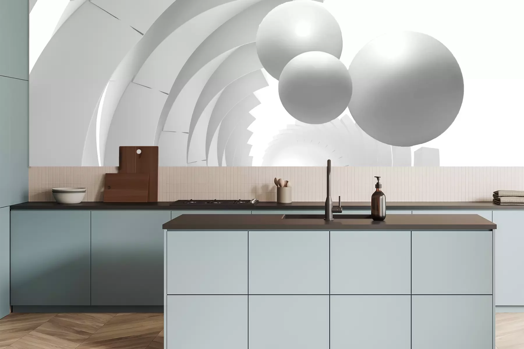 Het materiaal Premium is een glad vinyl op vlies, dat bestand is tegen uitrekken en vervorming. Het is dampdoorlatend – de muren kunnen vrij ademen – waardoor het geschikt is voor gebruik in de keuken en badkamer. Bij vervuiling kan het materiaal worden afgenomen met een vochtige doek. De maximale breedte van één baan bedraagt 95 of 105 cm, afhankelijk van de beschikbaarheid. Montage vindt plaats met de rand-aan-rand methode, wat een esthetisch resultaat zonder zichtbare naden oplevert. Omdat de lijm rechtstreeks op de muur wordt aangebracht, verloopt de installatie van het fotobehang snel en eenvoudig.