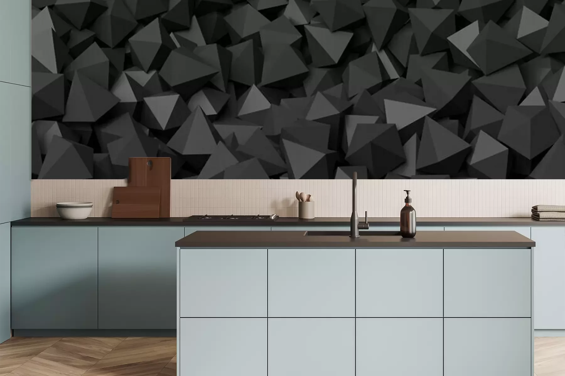 Het materiaal Premium is een glad vinyl op vlies, dat bestand is tegen uitrekken en vervorming. Het is dampdoorlatend – de muren kunnen vrij ademen – waardoor het geschikt is voor gebruik in de keuken en badkamer. Bij vervuiling kan het materiaal worden afgenomen met een vochtige doek. De maximale breedte van één baan bedraagt 95 of 105 cm, afhankelijk van de beschikbaarheid. Montage vindt plaats met de rand-aan-rand methode, wat een esthetisch resultaat zonder zichtbare naden oplevert. Omdat de lijm rechtstreeks op de muur wordt aangebracht, verloopt de installatie van het fotobehang snel en eenvoudig.