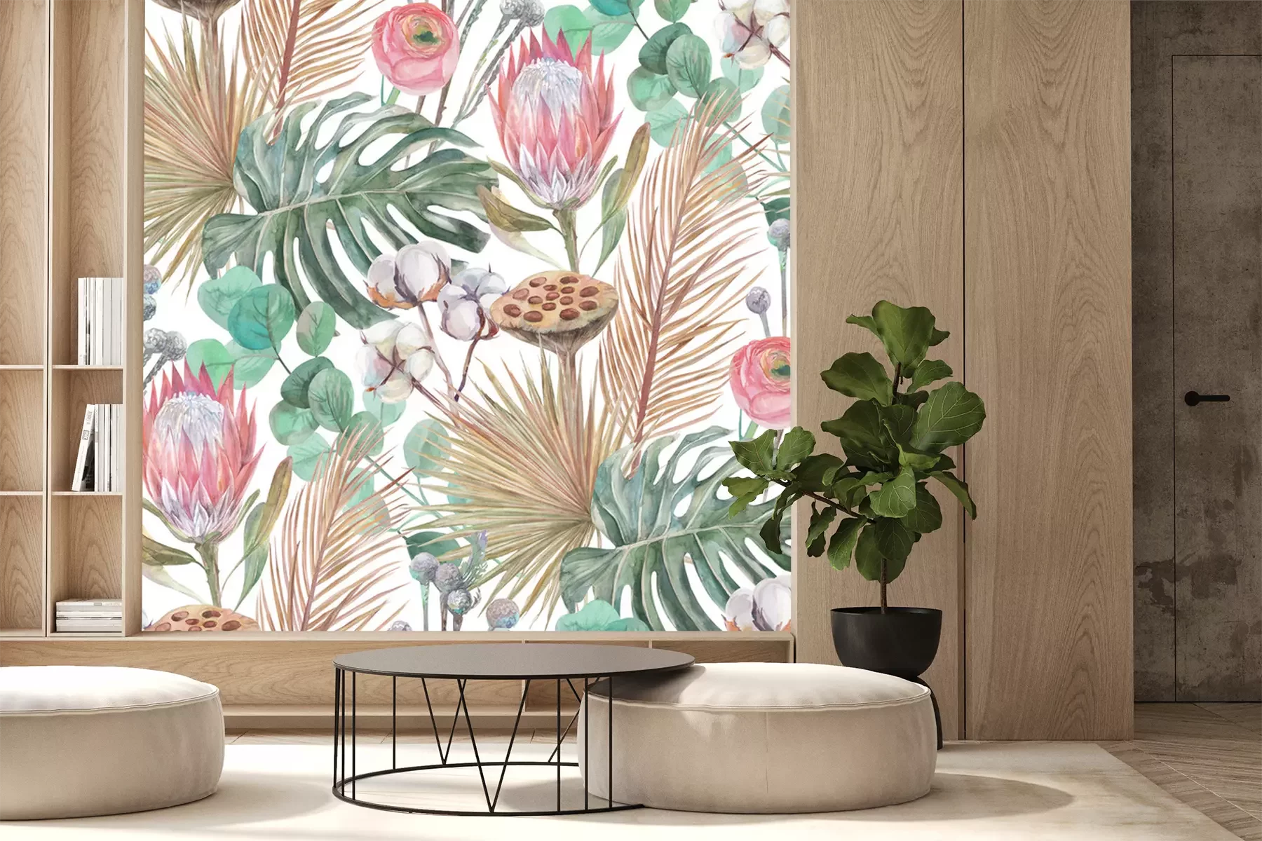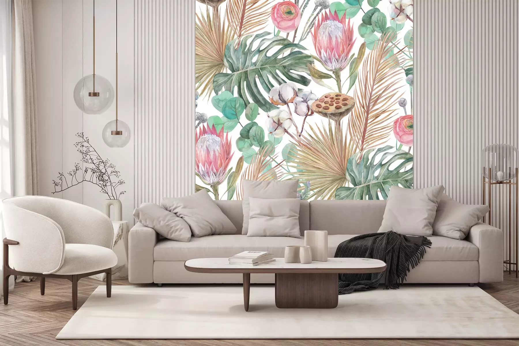 Fotobehang a modern boho style pattern tropical dried flowers and a proteus flower are painted in watercolor with sprigs of cotton a turquoise background