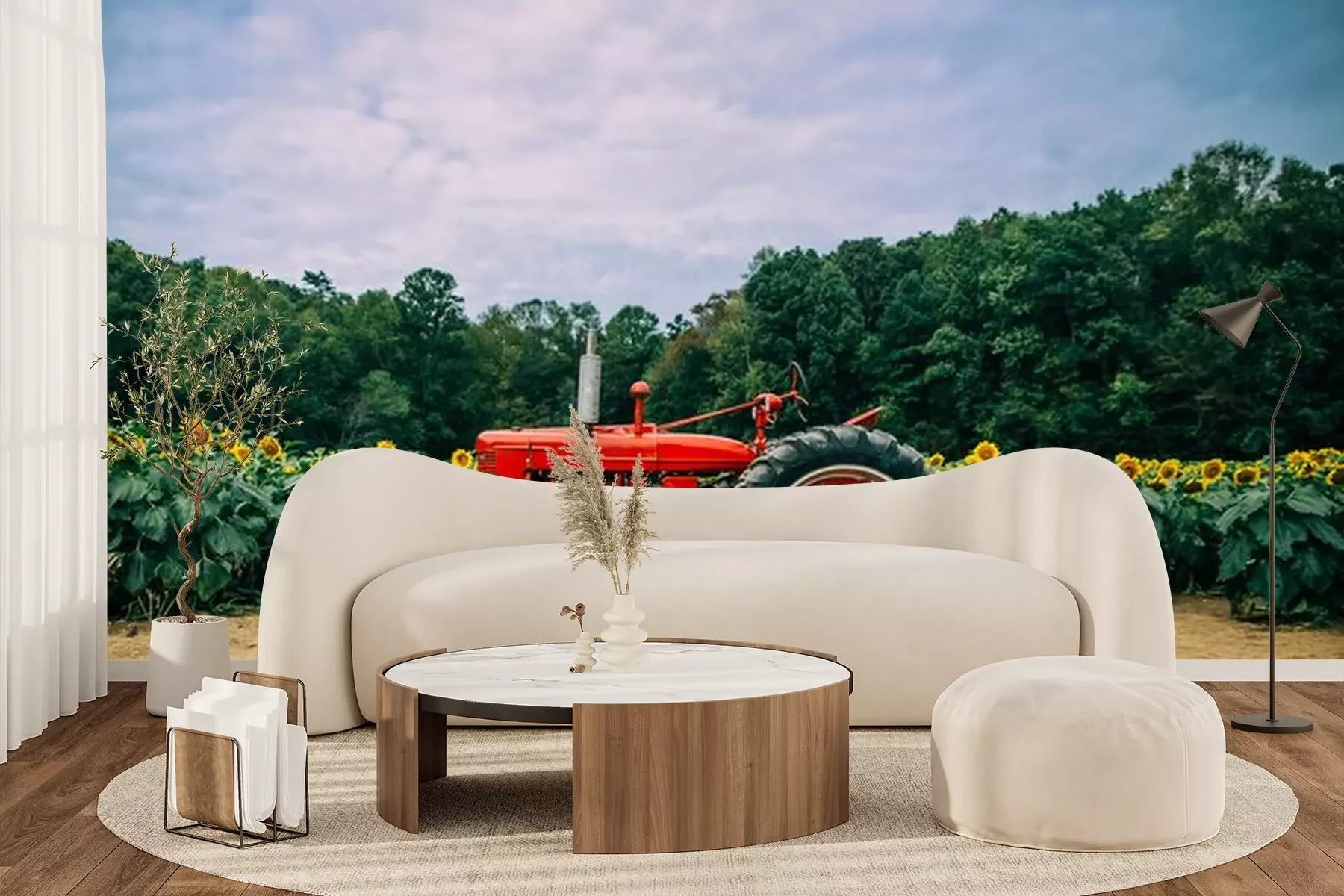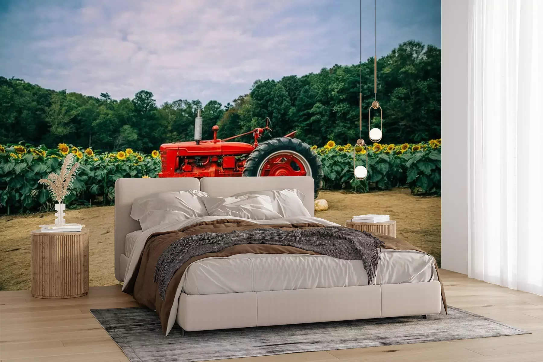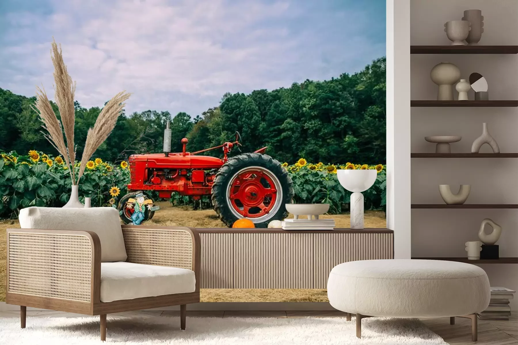 Fotobehang A red vintage old antique tractor in front of a sunflower field with pumpkins and a scarecrow in the Autumn for decoration