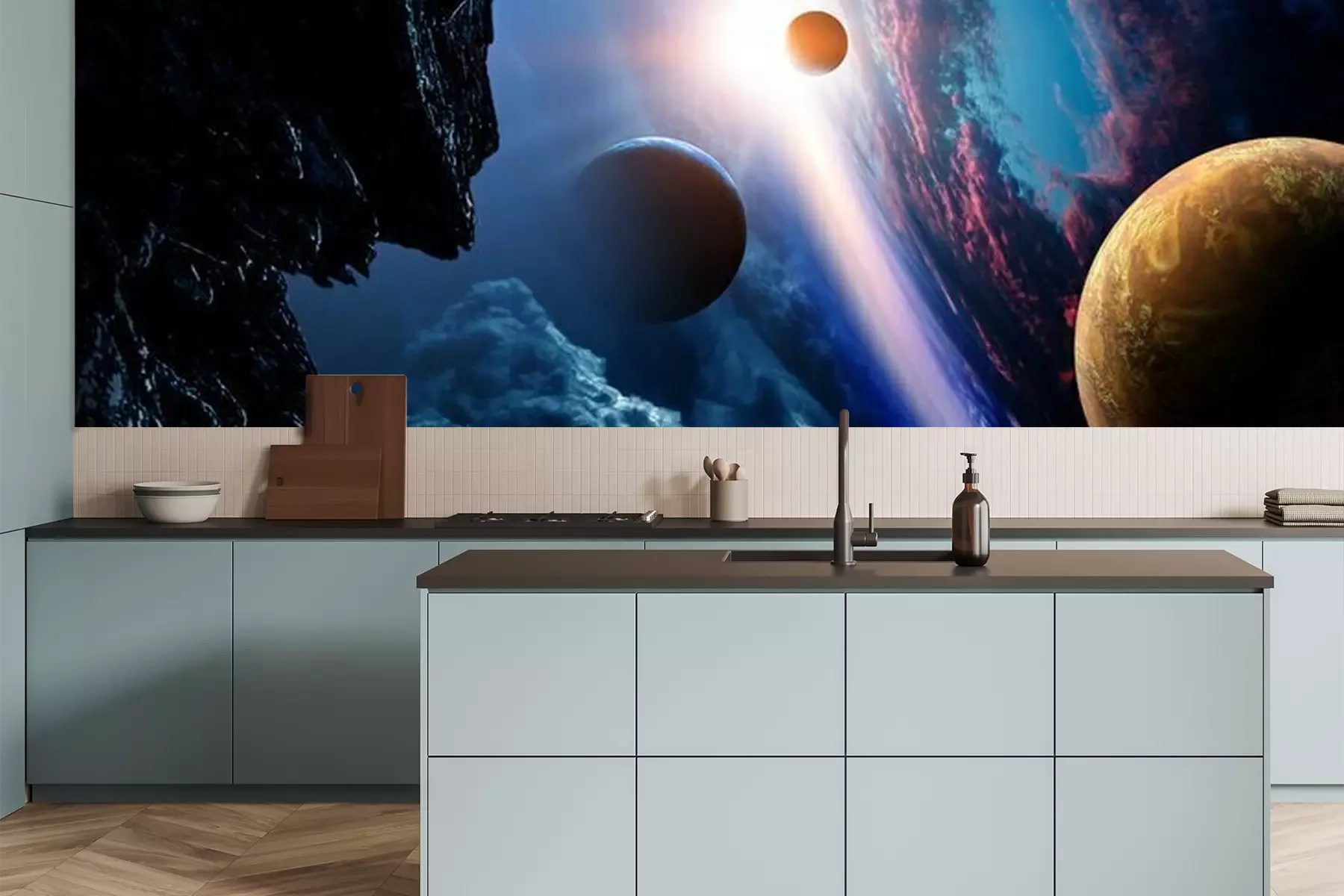 Het materiaal Premium is een glad vinyl op vlies, dat bestand is tegen uitrekken en vervorming. Het is dampdoorlatend – de muren kunnen vrij ademen – waardoor het geschikt is voor gebruik in de keuken en badkamer. Bij vervuiling kan het materiaal worden afgenomen met een vochtige doek. De maximale breedte van één baan bedraagt 95 of 105 cm, afhankelijk van de beschikbaarheid. Montage vindt plaats met de rand-aan-rand methode, wat een esthetisch resultaat zonder zichtbare naden oplevert. Omdat de lijm rechtstreeks op de muur wordt aangebracht, verloopt de installatie van het fotobehang snel en eenvoudig.