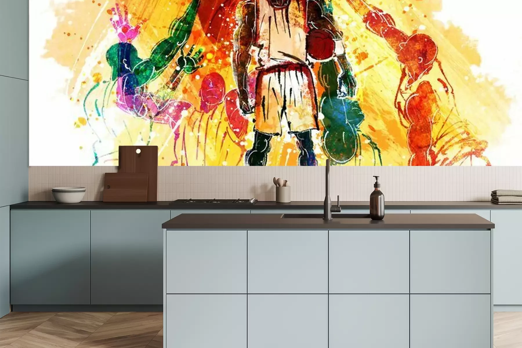 Het materiaal Premium is een glad vinyl op vlies, dat bestand is tegen uitrekken en vervorming. Het is dampdoorlatend – de muren kunnen vrij ademen – waardoor het geschikt is voor gebruik in de keuken en badkamer. Bij vervuiling kan het materiaal worden afgenomen met een vochtige doek. De maximale breedte van één baan bedraagt 95 of 105 cm, afhankelijk van de beschikbaarheid. Montage vindt plaats met de rand-aan-rand methode, wat een esthetisch resultaat zonder zichtbare naden oplevert. Omdat de lijm rechtstreeks op de muur wordt aangebracht, verloopt de installatie van het fotobehang snel en eenvoudig.