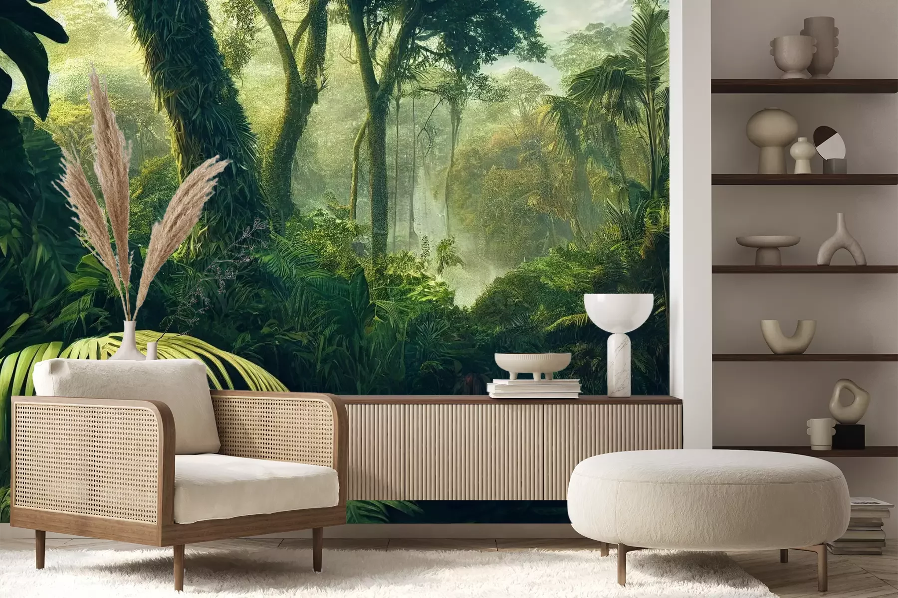Het materiaal Premium+ is een gestructureerd vinyl op vlies met een gewicht van 255 g/m², dat kleine oneffenheden in de muur effectief camoufleert. De subtiele structuur van fijn zand geeft het oppervlak een exclusieve uitstraling, terwijl de halfmatte afwerking de diepte van de kleuren benadrukt. Het materiaal is dampdoorlatend, waardoor het ook in de keuken en badkamer kan worden gebruikt. De maximale breedte van één baan bedraagt 100 cm – bij grotere afmetingen wordt het fotobehang in meerdere gelijke banen verdeeld. De lijm wordt direct op de muur aangebracht en het behang wordt rand-aan-rand geplakt, wat zorgt voor een esthetisch resultaat zonder zichtbare naden. Het oppervlak kan gemakkelijk worden schoongemaakt door het voorzichtig af te nemen met een vochtige doek.