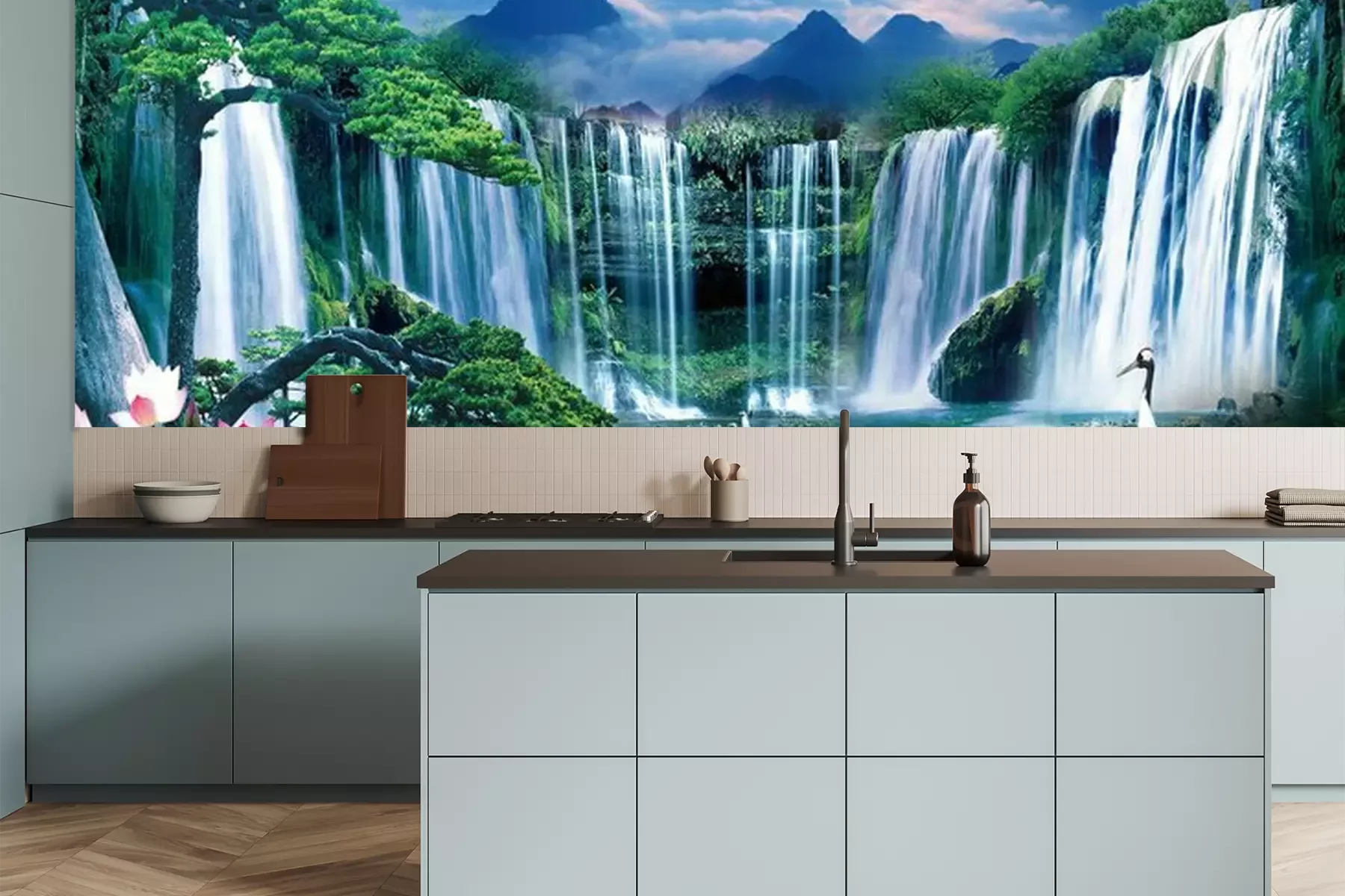 Het materiaal Premium is een glad vinyl op vlies, dat bestand is tegen uitrekken en vervorming. Het is dampdoorlatend – de muren kunnen vrij ademen – waardoor het geschikt is voor gebruik in de keuken en badkamer. Bij vervuiling kan het materiaal worden afgenomen met een vochtige doek. De maximale breedte van één baan bedraagt 95 of 105 cm, afhankelijk van de beschikbaarheid. Montage vindt plaats met de rand-aan-rand methode, wat een esthetisch resultaat zonder zichtbare naden oplevert. Omdat de lijm rechtstreeks op de muur wordt aangebracht, verloopt de installatie van het fotobehang snel en eenvoudig.