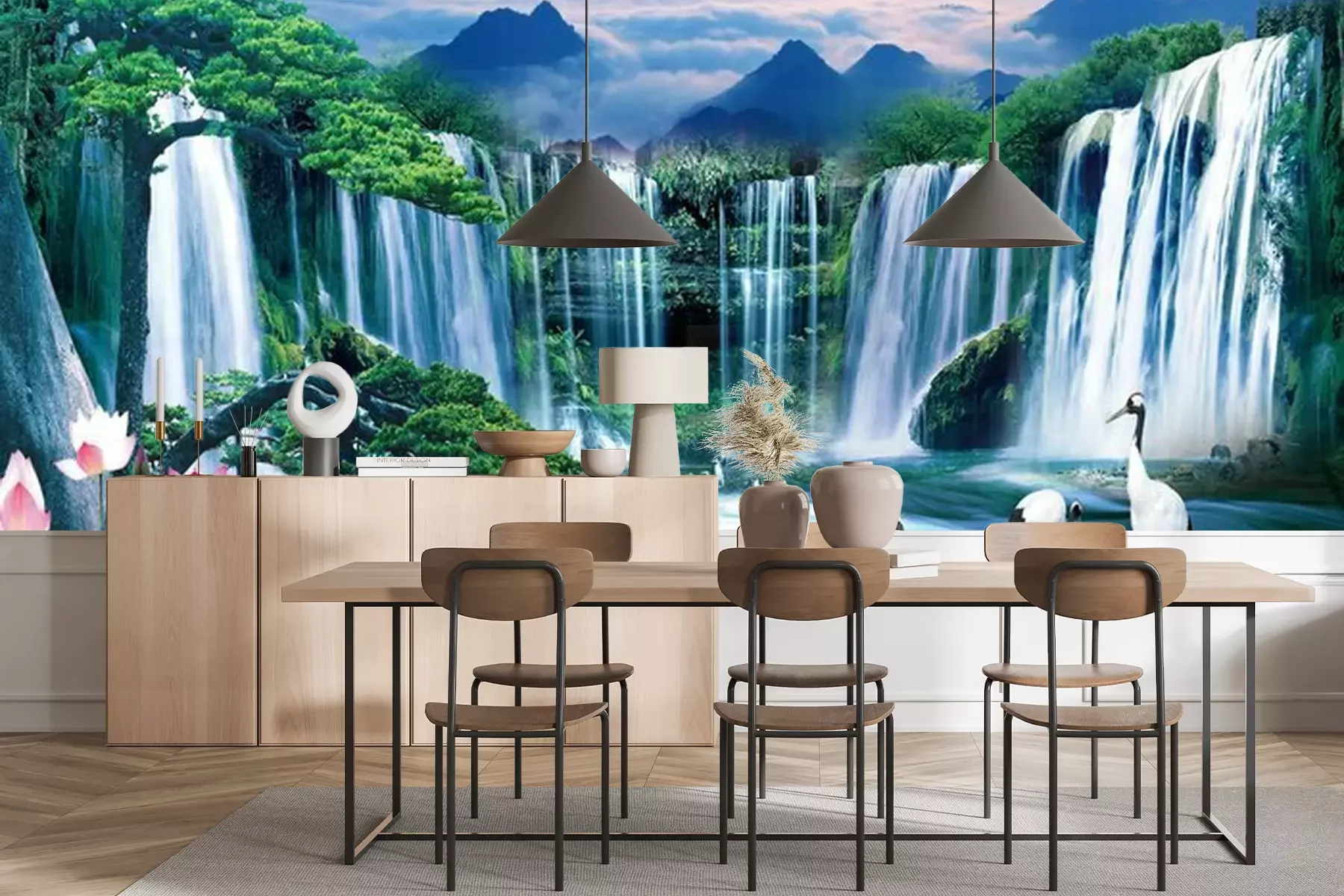 Het materiaal Premium+ is een gestructureerd vinyl op vlies met een gewicht van 255 g/m², dat kleine oneffenheden in de muur effectief camoufleert. De subtiele structuur van fijn zand geeft het oppervlak een exclusieve uitstraling, terwijl de halfmatte afwerking de diepte van de kleuren benadrukt. Het materiaal is dampdoorlatend, waardoor het ook in de keuken en badkamer kan worden gebruikt. De maximale breedte van één baan bedraagt 100 cm – bij grotere afmetingen wordt het fotobehang in meerdere gelijke banen verdeeld. De lijm wordt direct op de muur aangebracht en het behang wordt rand-aan-rand geplakt, wat zorgt voor een esthetisch resultaat zonder zichtbare naden. Het oppervlak kan gemakkelijk worden schoongemaakt door het voorzichtig af te nemen met een vochtige doek.