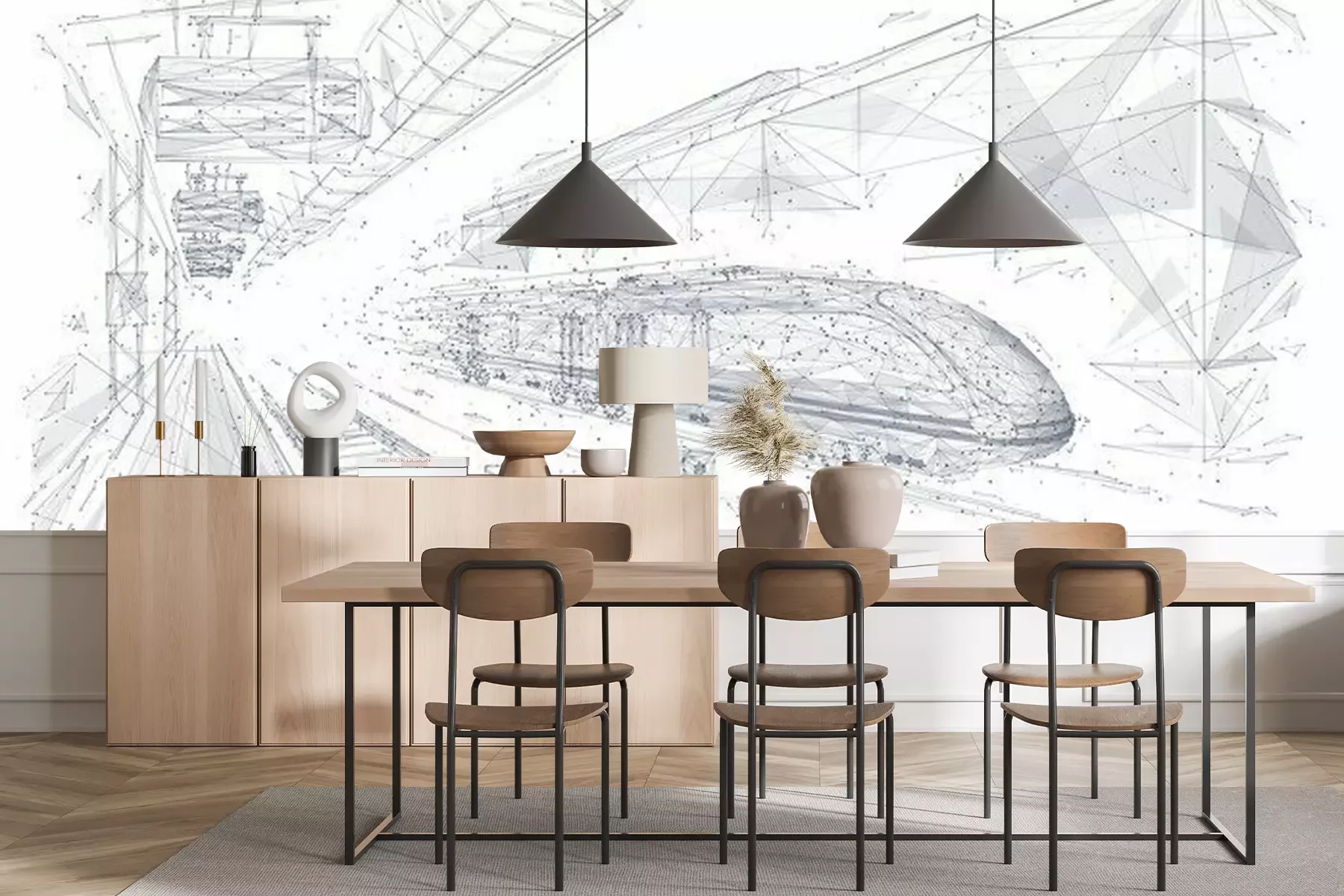 Fotobehang Abstract low poly 3d wireframe of modern train at railway station or metro. Vector sketch drawing with connected dots. Rapid transit system, transportation, railway logistics concept isolated in white