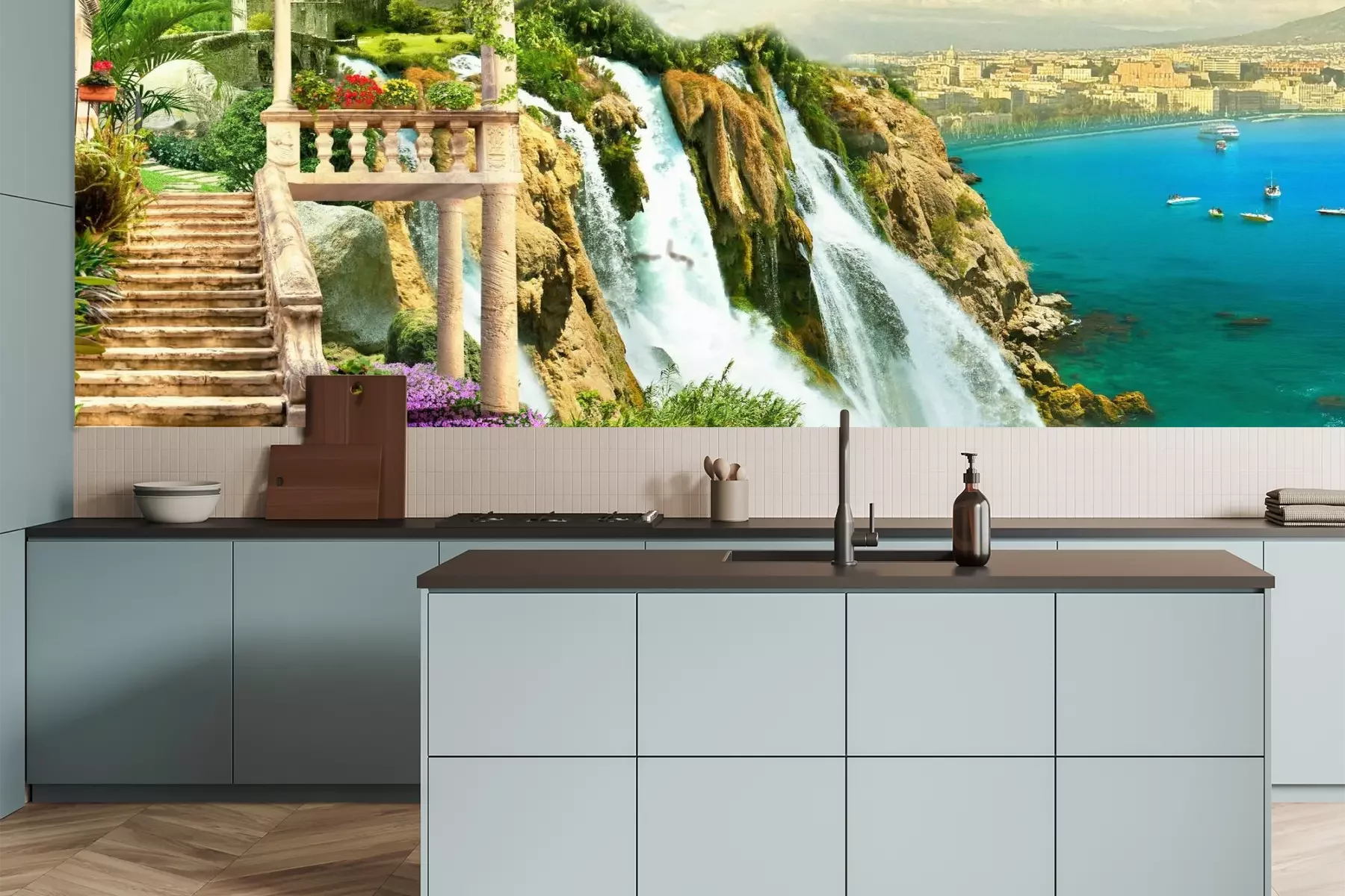 Het materiaal Premium is een glad vinyl op vlies, dat bestand is tegen uitrekken en vervorming. Het is dampdoorlatend – de muren kunnen vrij ademen – waardoor het geschikt is voor gebruik in de keuken en badkamer. Bij vervuiling kan het materiaal worden afgenomen met een vochtige doek. De maximale breedte van één baan bedraagt 95 of 105 cm, afhankelijk van de beschikbaarheid. Montage vindt plaats met de rand-aan-rand methode, wat een esthetisch resultaat zonder zichtbare naden oplevert. Omdat de lijm rechtstreeks op de muur wordt aangebracht, verloopt de installatie van het fotobehang snel en eenvoudig.