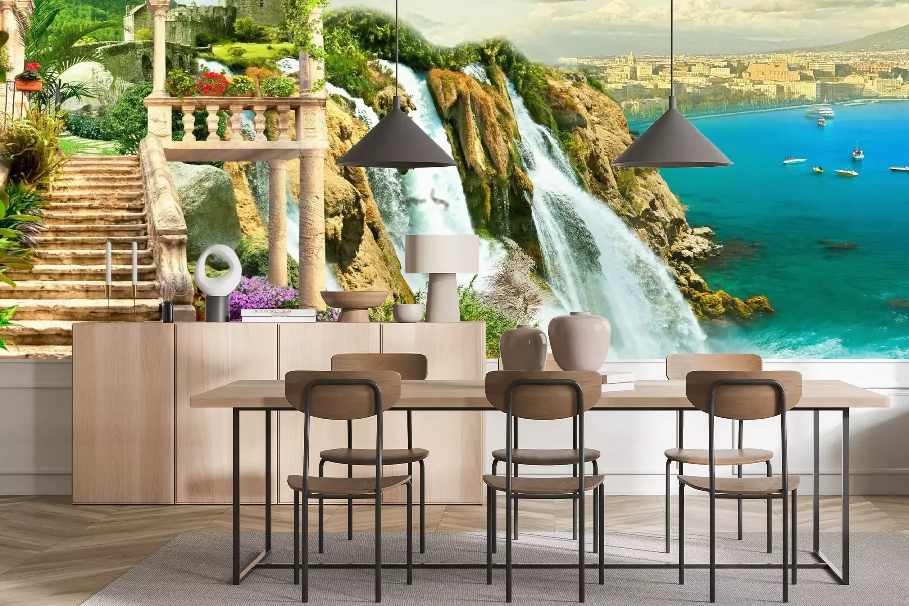 Het materiaal Premium+ is een gestructureerd vinyl op vlies met een gewicht van 255 g/m², dat kleine oneffenheden in de muur effectief camoufleert. De subtiele structuur van fijn zand geeft het oppervlak een exclusieve uitstraling, terwijl de halfmatte afwerking de diepte van de kleuren benadrukt. Het materiaal is dampdoorlatend, waardoor het ook in de keuken en badkamer kan worden gebruikt. De maximale breedte van één baan bedraagt 100 cm – bij grotere afmetingen wordt het fotobehang in meerdere gelijke banen verdeeld. De lijm wordt direct op de muur aangebracht en het behang wordt rand-aan-rand geplakt, wat zorgt voor een esthetisch resultaat zonder zichtbare naden. Het oppervlak kan gemakkelijk worden schoongemaakt door het voorzichtig af te nemen met een vochtige doek.