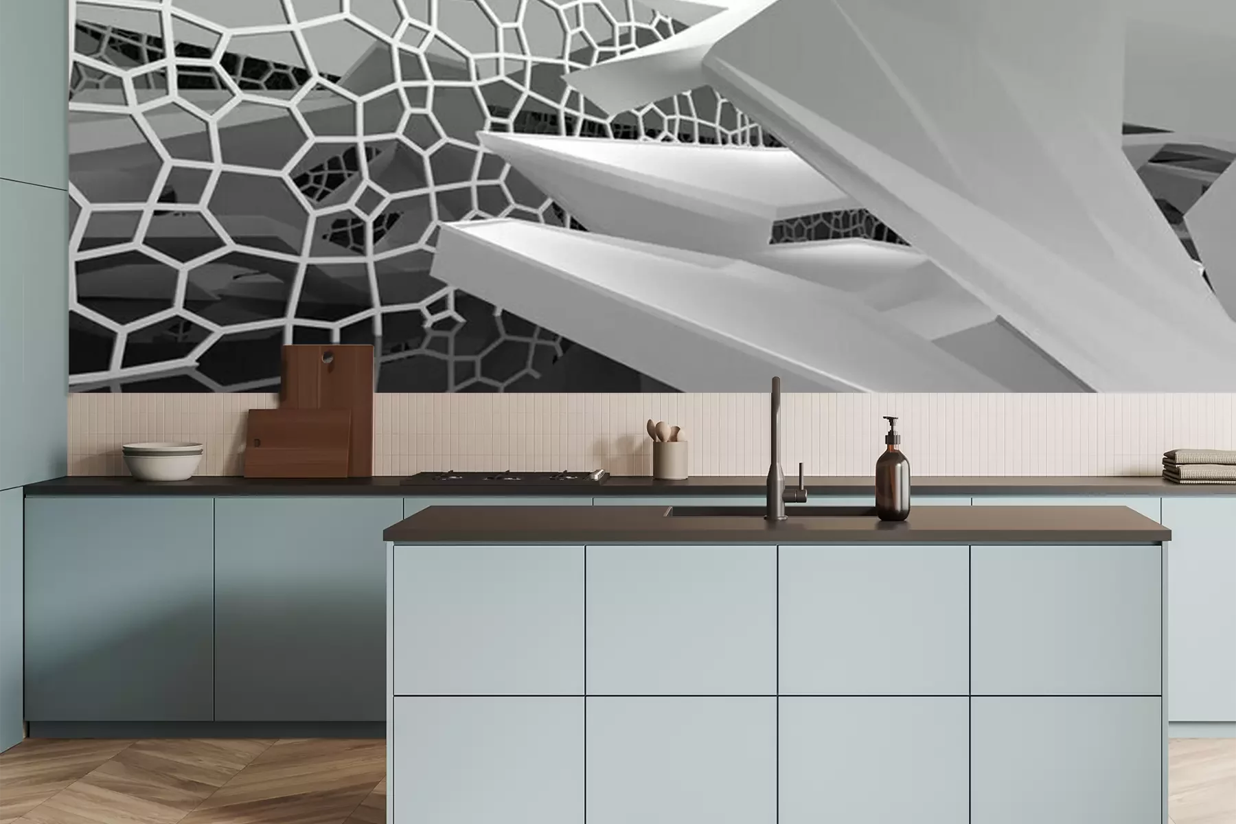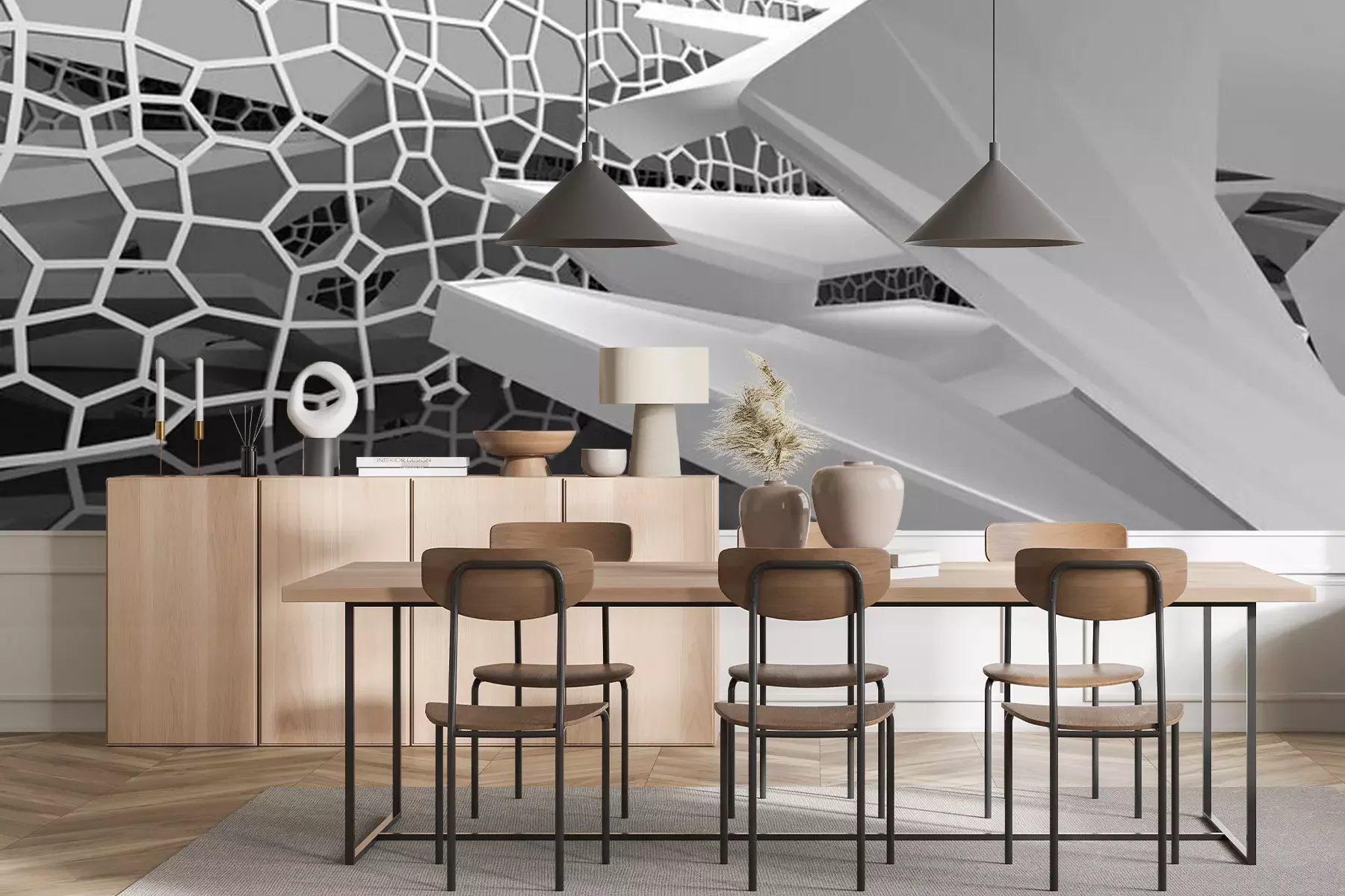 Fotobehang Abstract white and black interior multilevel public space with window. 3D illustration and rendering.
