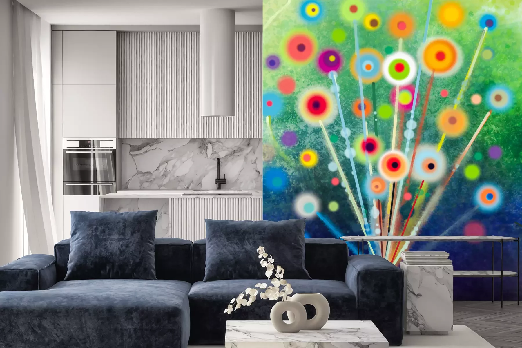 Het materiaal Premium+ is een gestructureerd vinyl op vlies met een gewicht van 255 g/m², dat kleine oneffenheden in de muur effectief camoufleert. De subtiele structuur van fijn zand geeft het oppervlak een exclusieve uitstraling, terwijl de halfmatte afwerking de diepte van de kleuren benadrukt. Het materiaal is dampdoorlatend, waardoor het ook in de keuken en badkamer kan worden gebruikt. De maximale breedte van één baan bedraagt 100 cm – bij grotere afmetingen wordt het fotobehang in meerdere gelijke banen verdeeld. De lijm wordt direct op de muur aangebracht en het behang wordt rand-aan-rand geplakt, wat zorgt voor een esthetisch resultaat zonder zichtbare naden. Het oppervlak kan gemakkelijk worden schoongemaakt door het voorzichtig af te nemen met een vochtige doek.