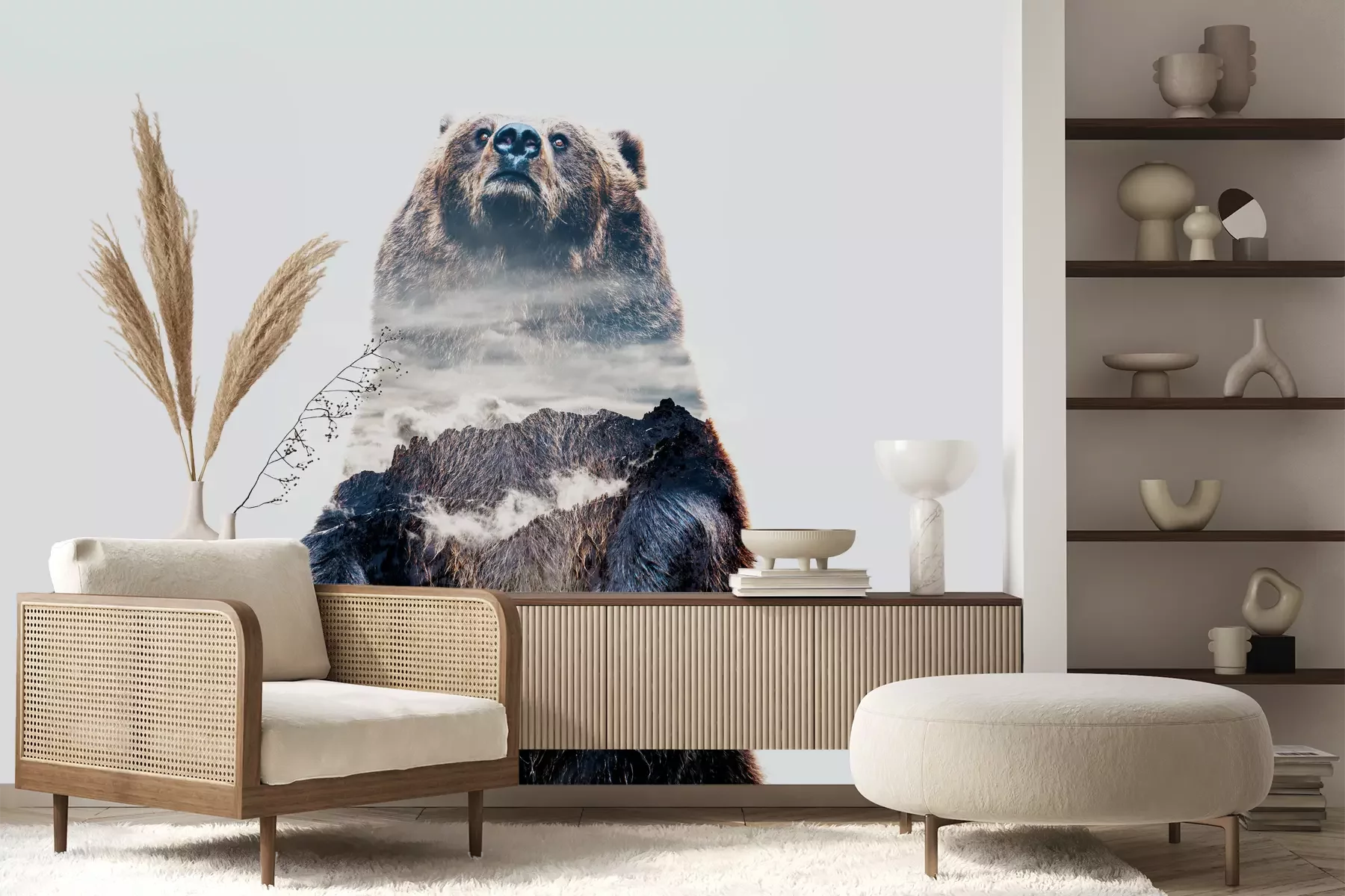 Een beer tegen een mistig berglandschapFotobehang
