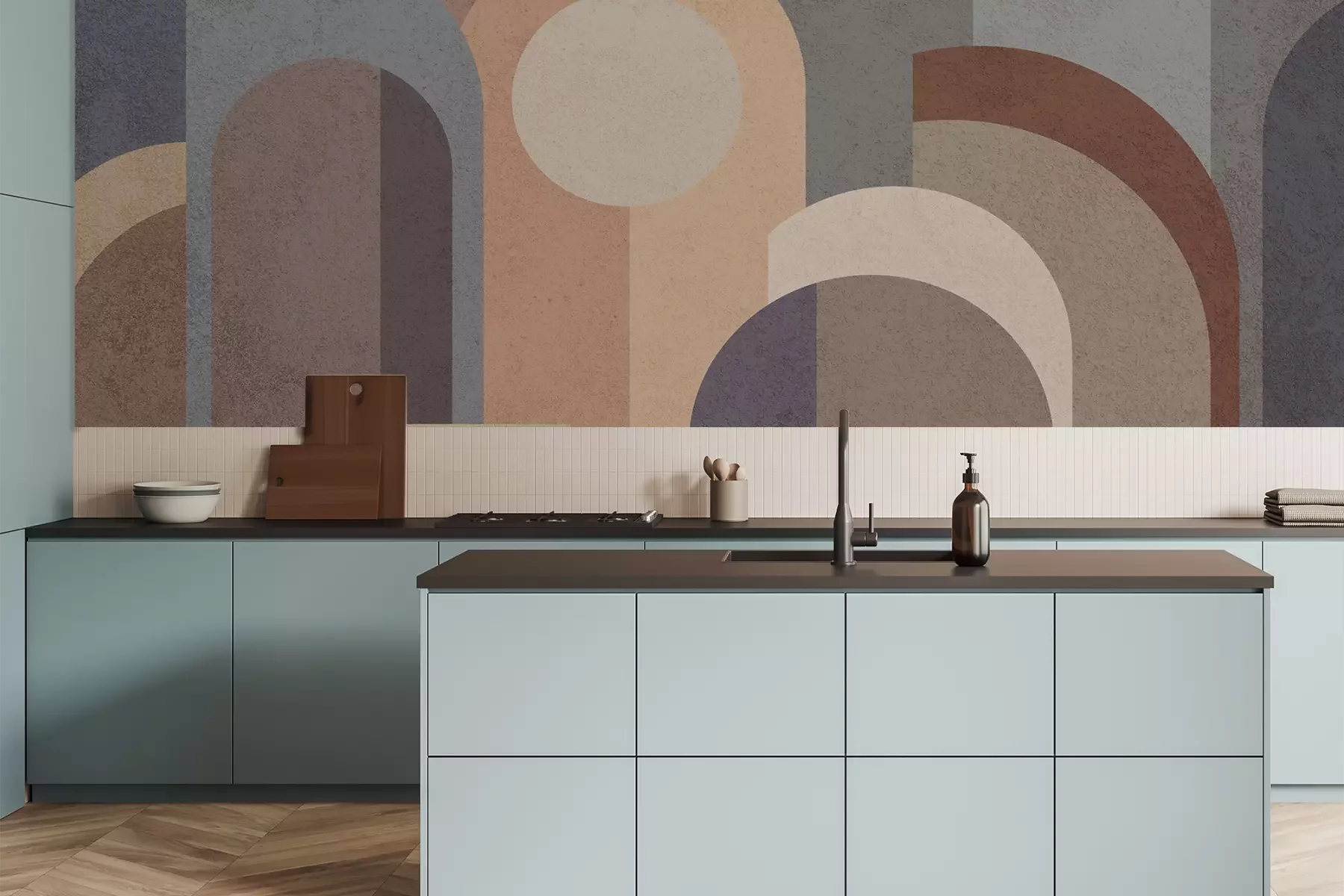 Het materiaal Premium is een glad vinyl op vlies, dat bestand is tegen uitrekken en vervorming. Het is dampdoorlatend – de muren kunnen vrij ademen – waardoor het geschikt is voor gebruik in de keuken en badkamer. Bij vervuiling kan het materiaal worden afgenomen met een vochtige doek. De maximale breedte van één baan bedraagt 95 of 105 cm, afhankelijk van de beschikbaarheid. Montage vindt plaats met de rand-aan-rand methode, wat een esthetisch resultaat zonder zichtbare naden oplevert. Omdat de lijm rechtstreeks op de muur wordt aangebracht, verloopt de installatie van het fotobehang snel en eenvoudig.