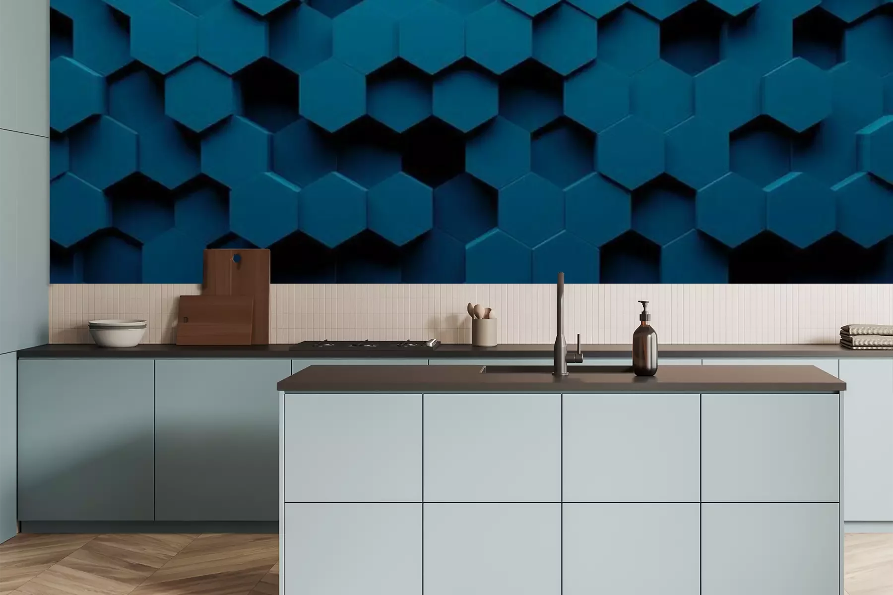 Het materiaal Premium is een glad vinyl op vlies, dat bestand is tegen uitrekken en vervorming. Het is dampdoorlatend – de muren kunnen vrij ademen – waardoor het geschikt is voor gebruik in de keuken en badkamer. Bij vervuiling kan het materiaal worden afgenomen met een vochtige doek. De maximale breedte van één baan bedraagt 95 of 105 cm, afhankelijk van de beschikbaarheid. Montage vindt plaats met de rand-aan-rand methode, wat een esthetisch resultaat zonder zichtbare naden oplevert. Omdat de lijm rechtstreeks op de muur wordt aangebracht, verloopt de installatie van het fotobehang snel en eenvoudig.