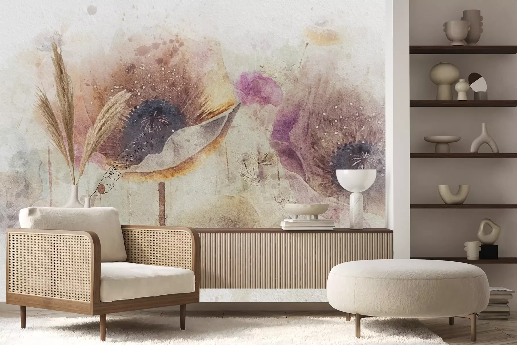 Het materiaal Premium+ is een gestructureerd vinyl op vlies met een gewicht van 255 g/m², dat kleine oneffenheden in de muur effectief camoufleert. De subtiele structuur van fijn zand geeft het oppervlak een exclusieve uitstraling, terwijl de halfmatte afwerking de diepte van de kleuren benadrukt. Het materiaal is dampdoorlatend, waardoor het ook in de keuken en badkamer kan worden gebruikt. De maximale breedte van één baan bedraagt 100 cm – bij grotere afmetingen wordt het fotobehang in meerdere gelijke banen verdeeld. De lijm wordt direct op de muur aangebracht en het behang wordt rand-aan-rand geplakt, wat zorgt voor een esthetisch resultaat zonder zichtbare naden. Het oppervlak kan gemakkelijk worden schoongemaakt door het voorzichtig af te nemen met een vochtige doek.