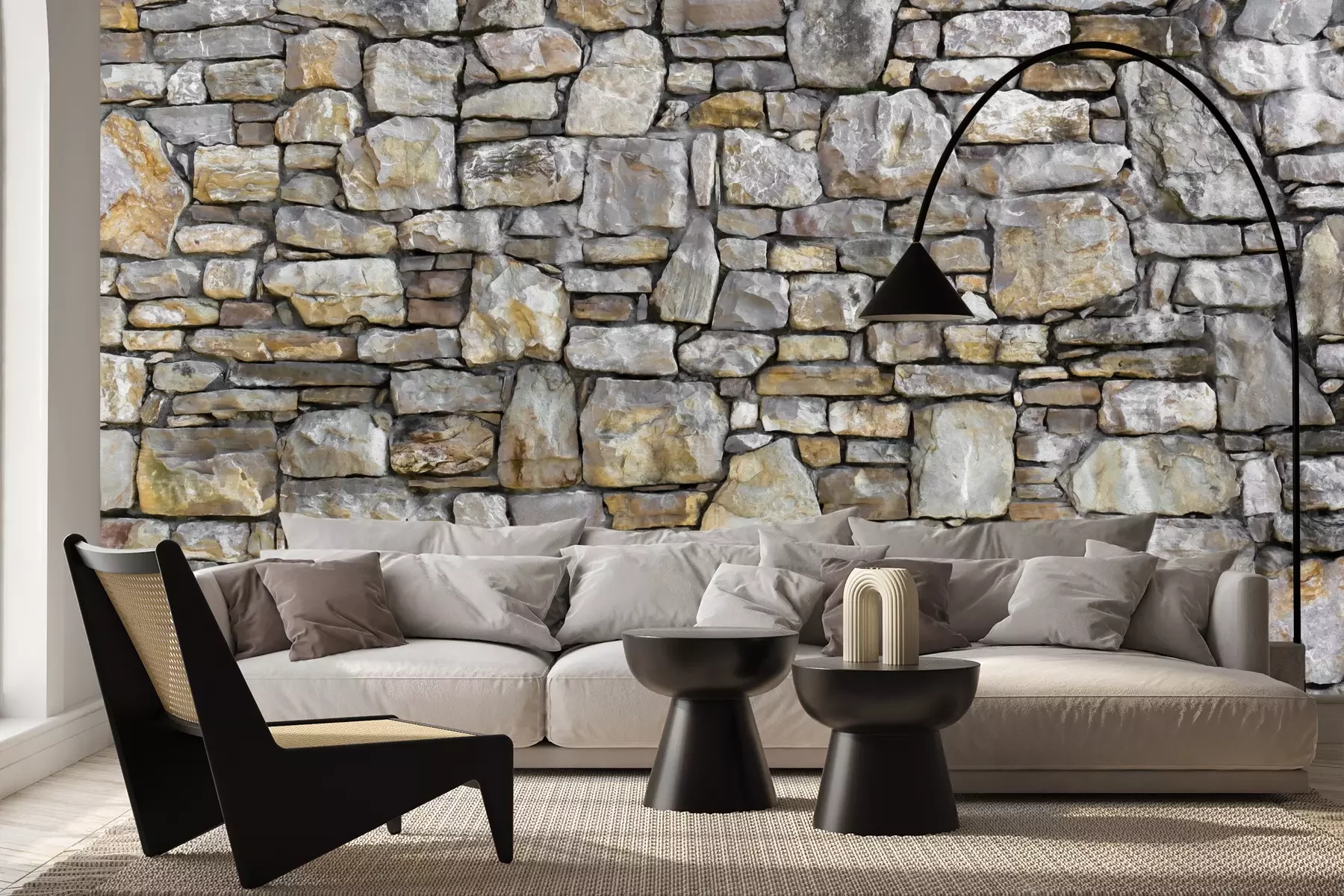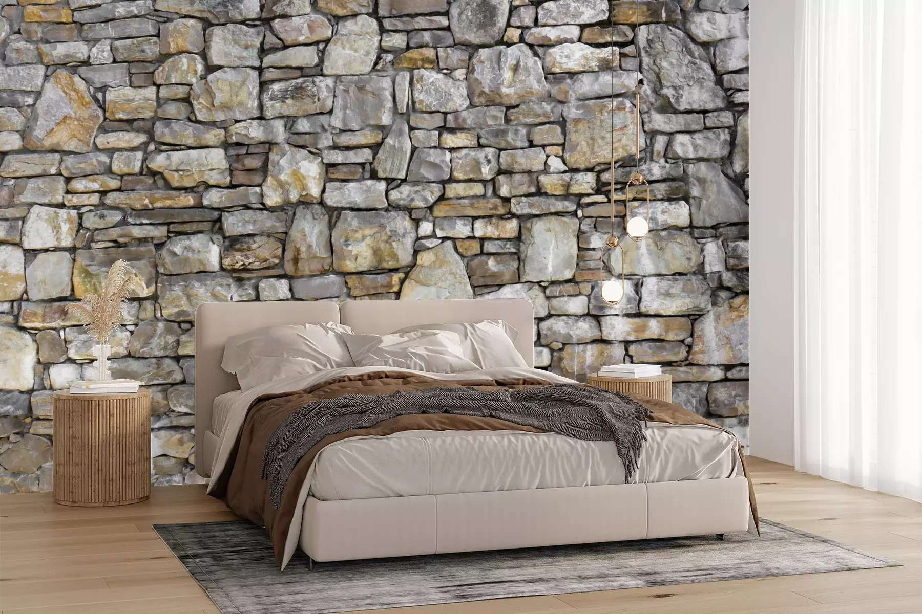 Het materiaal Premium+ is een gestructureerd vinyl op vlies met een gewicht van 255 g/m², dat kleine oneffenheden in de muur effectief camoufleert. De subtiele structuur van fijn zand geeft het oppervlak een exclusieve uitstraling, terwijl de halfmatte afwerking de diepte van de kleuren benadrukt. Het materiaal is dampdoorlatend, waardoor het ook in de keuken en badkamer kan worden gebruikt. De maximale breedte van één baan bedraagt 100 cm – bij grotere afmetingen wordt het fotobehang in meerdere gelijke banen verdeeld. De lijm wordt direct op de muur aangebracht en het behang wordt rand-aan-rand geplakt, wat zorgt voor een esthetisch resultaat zonder zichtbare naden. Het oppervlak kan gemakkelijk worden schoongemaakt door het voorzichtig af te nemen met een vochtige doek.