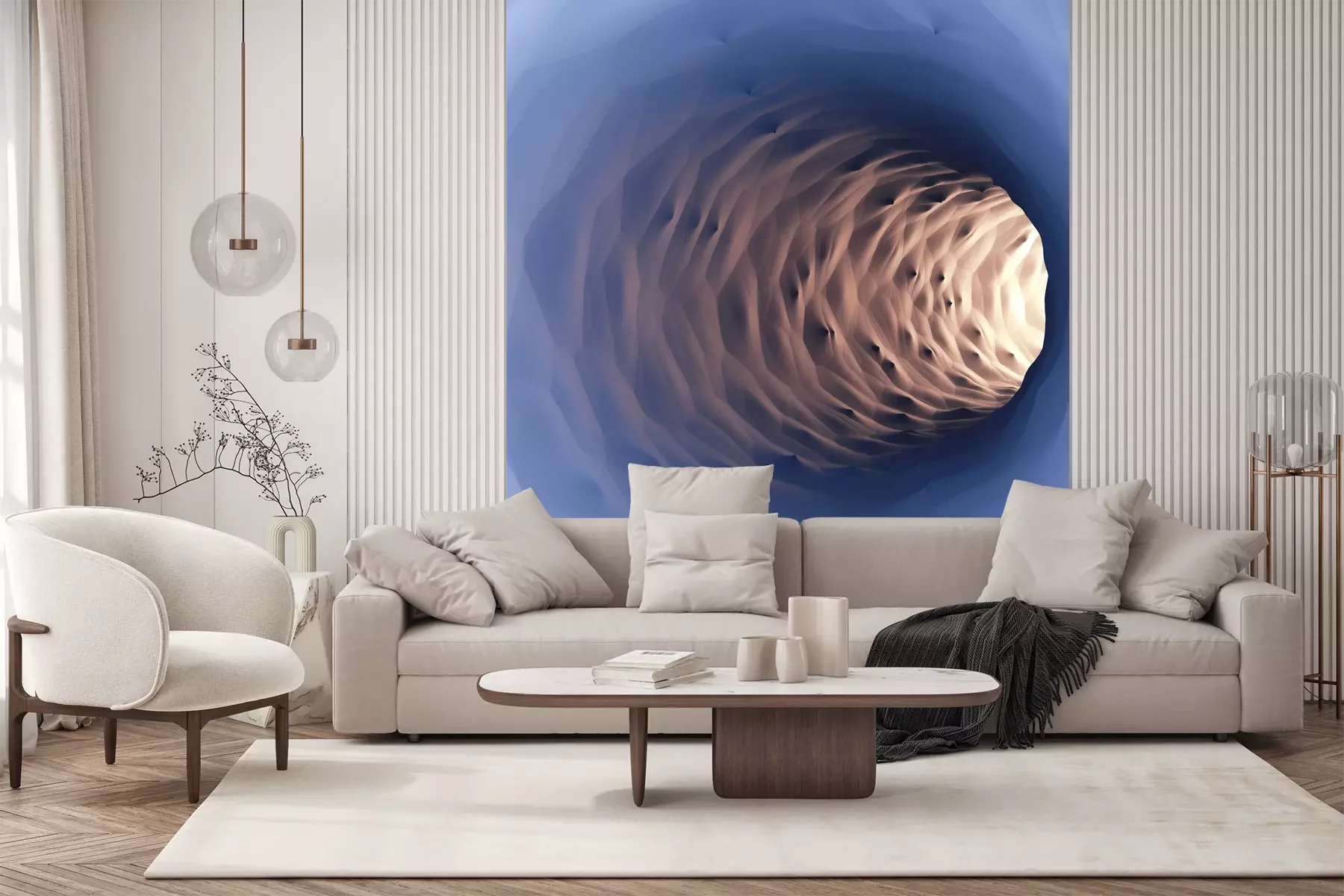 Het materiaal Premium+ is een gestructureerd vinyl op vlies met een gewicht van 255 g/m², dat kleine oneffenheden in de muur effectief camoufleert. De subtiele structuur van fijn zand geeft het oppervlak een exclusieve uitstraling, terwijl de halfmatte afwerking de diepte van de kleuren benadrukt. Het materiaal is dampdoorlatend, waardoor het ook in de keuken en badkamer kan worden gebruikt. De maximale breedte van één baan bedraagt 100 cm – bij grotere afmetingen wordt het fotobehang in meerdere gelijke banen verdeeld. De lijm wordt direct op de muur aangebracht en het behang wordt rand-aan-rand geplakt, wat zorgt voor een esthetisch resultaat zonder zichtbare naden. Het oppervlak kan gemakkelijk worden schoongemaakt door het voorzichtig af te nemen met een vochtige doek.