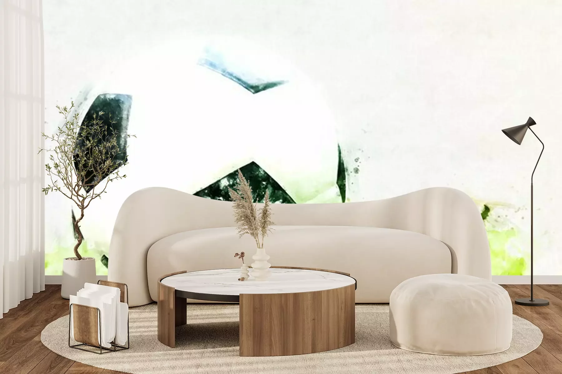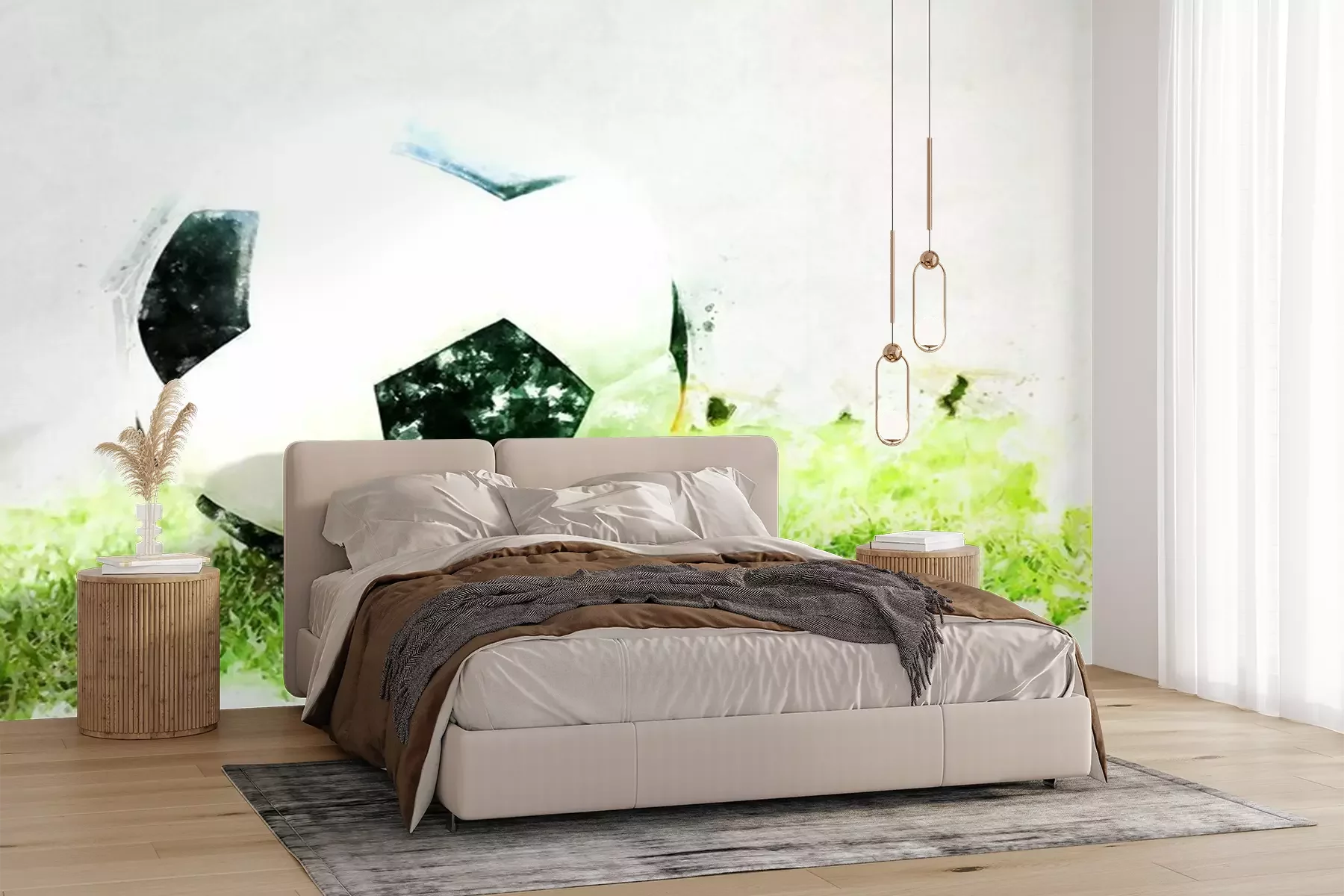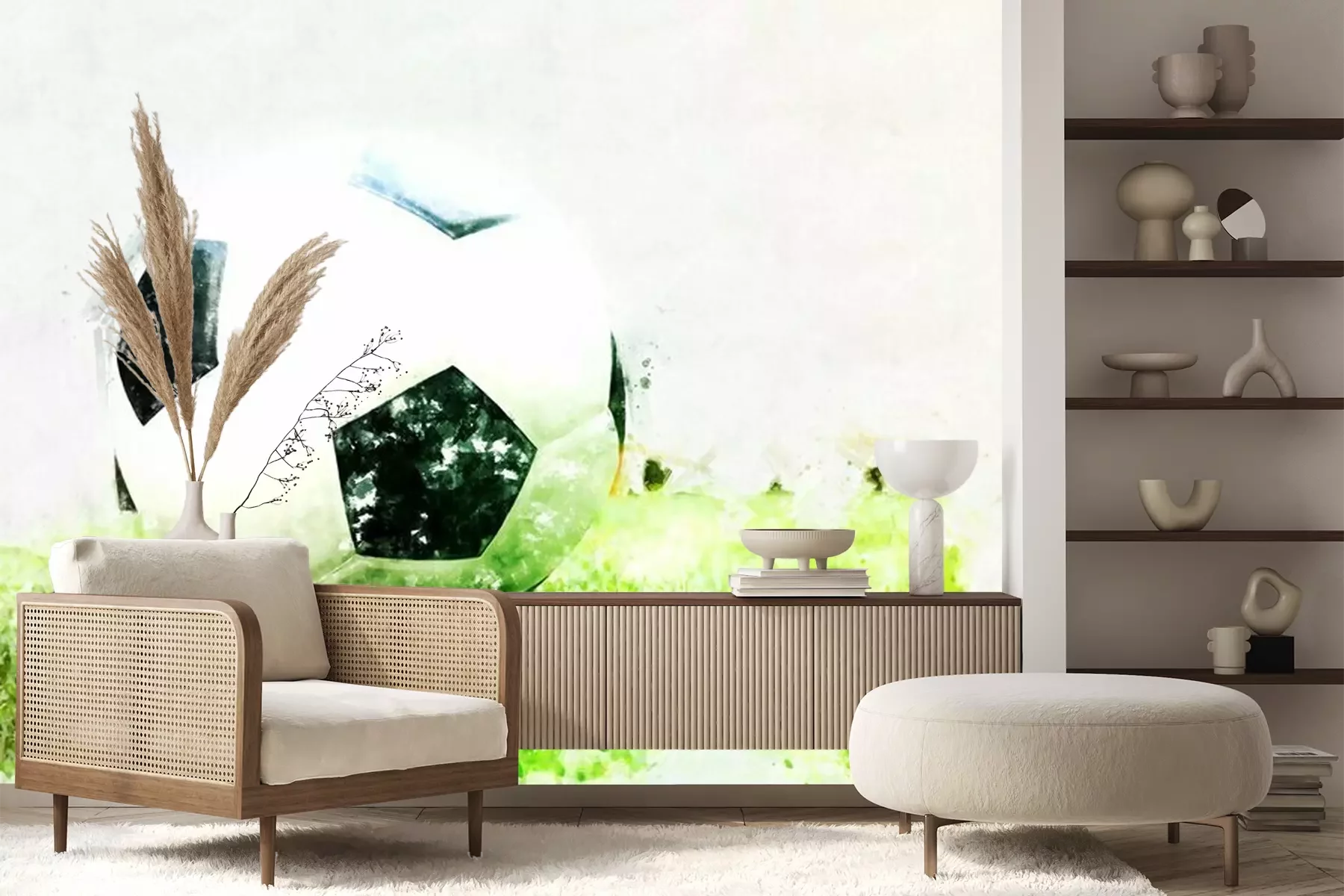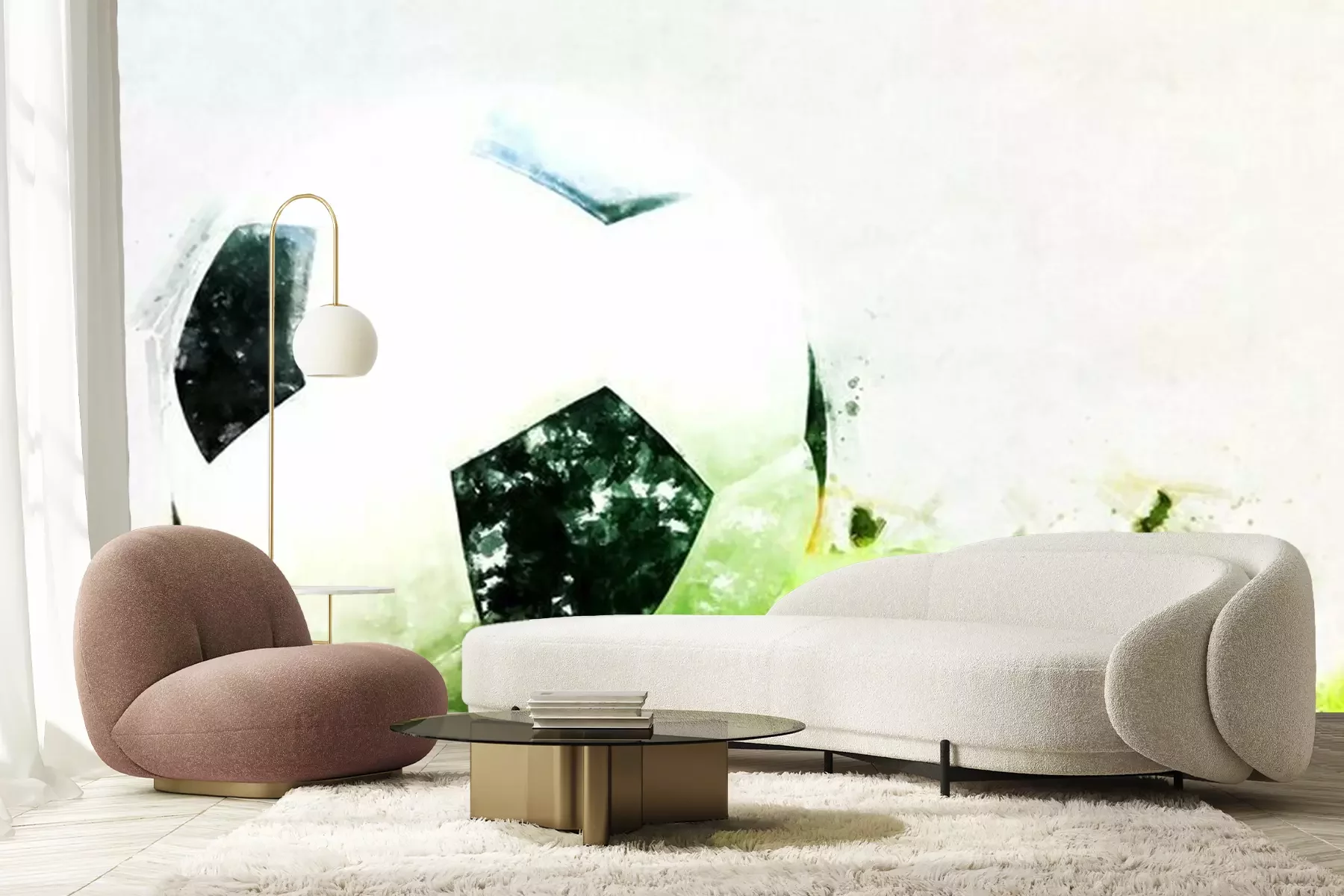 Fotobehang Abstracte voetbalbal op groene graswaterverf het schilderen achtergrond.