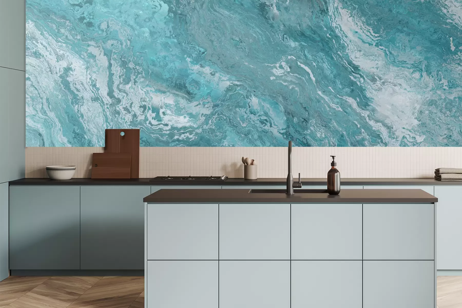 Het materiaal Premium is een glad vinyl op vlies, dat bestand is tegen uitrekken en vervorming. Het is dampdoorlatend – de muren kunnen vrij ademen – waardoor het geschikt is voor gebruik in de keuken en badkamer. Bij vervuiling kan het materiaal worden afgenomen met een vochtige doek. De maximale breedte van één baan bedraagt 95 of 105 cm, afhankelijk van de beschikbaarheid. Montage vindt plaats met de rand-aan-rand methode, wat een esthetisch resultaat zonder zichtbare naden oplevert. Omdat de lijm rechtstreeks op de muur wordt aangebracht, verloopt de installatie van het fotobehang snel en eenvoudig.