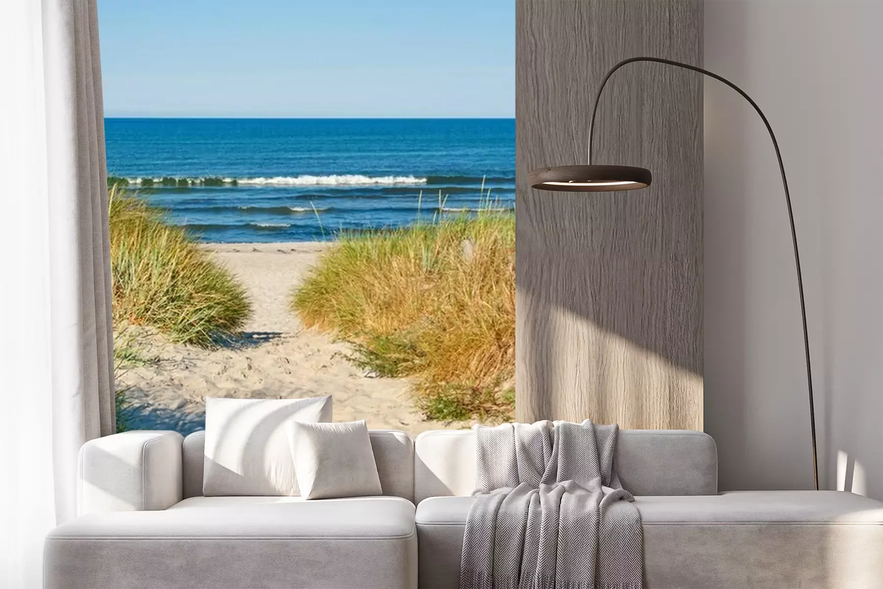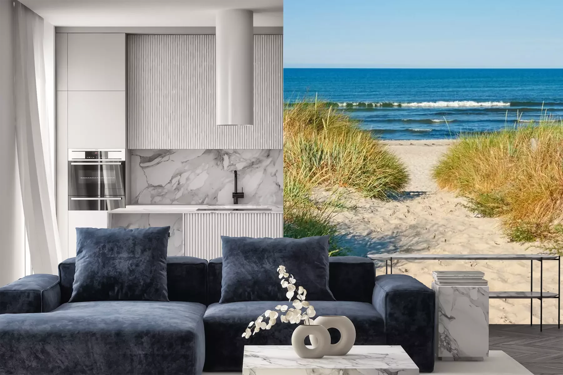 Het materiaal Premium+ is een gestructureerd vinyl op vlies met een gewicht van 255 g/m², dat kleine oneffenheden in de muur effectief camoufleert. De subtiele structuur van fijn zand geeft het oppervlak een exclusieve uitstraling, terwijl de halfmatte afwerking de diepte van de kleuren benadrukt. Het materiaal is dampdoorlatend, waardoor het ook in de keuken en badkamer kan worden gebruikt. De maximale breedte van één baan bedraagt 100 cm – bij grotere afmetingen wordt het fotobehang in meerdere gelijke banen verdeeld. De lijm wordt direct op de muur aangebracht en het behang wordt rand-aan-rand geplakt, wat zorgt voor een esthetisch resultaat zonder zichtbare naden. Het oppervlak kan gemakkelijk worden schoongemaakt door het voorzichtig af te nemen met een vochtige doek.