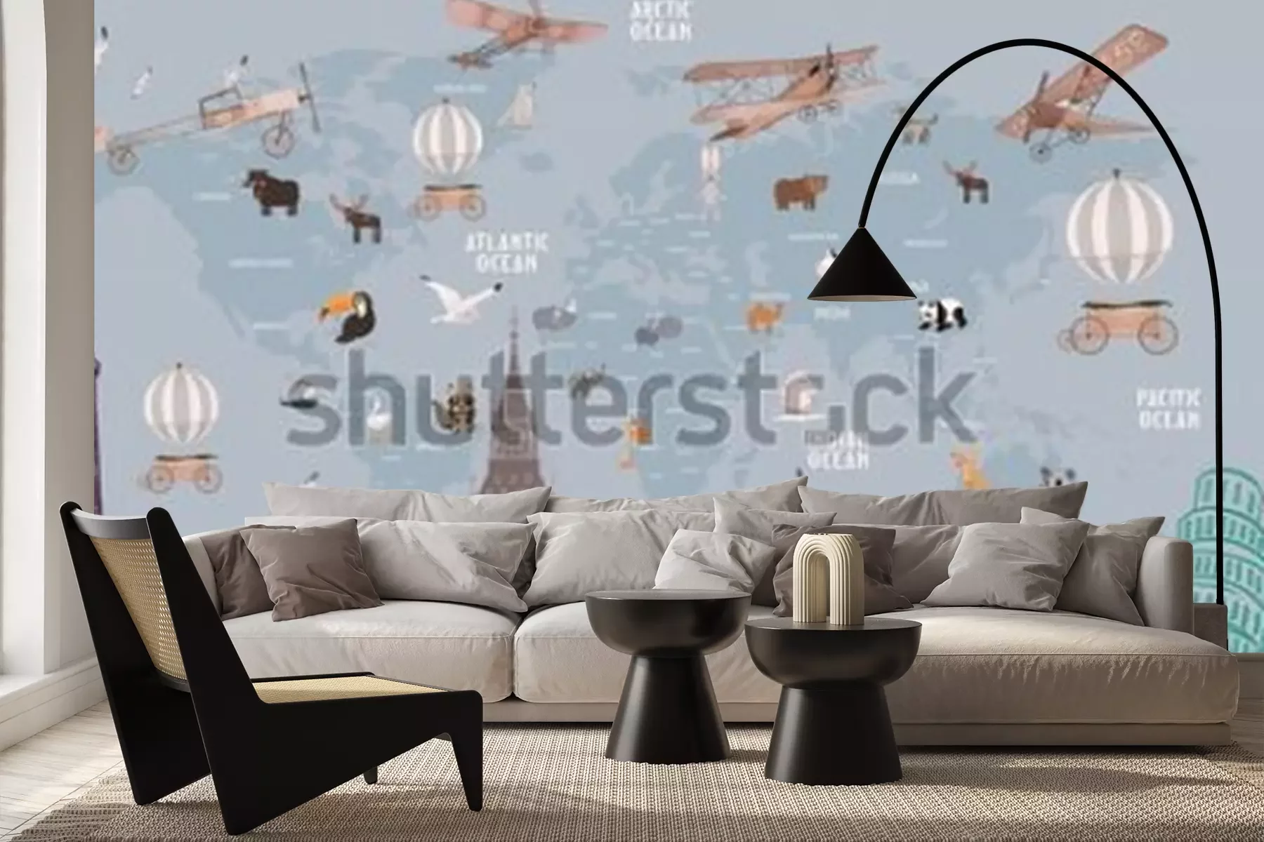 Fotobehang Animals world map and famous landmarks of the world for kids wallpaper design