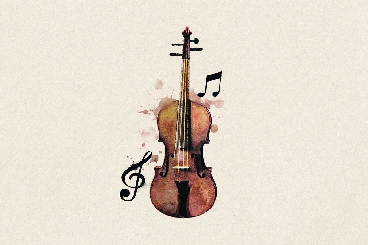 Fotobehang: Aquarel viool met bladmuziek muurillustratie