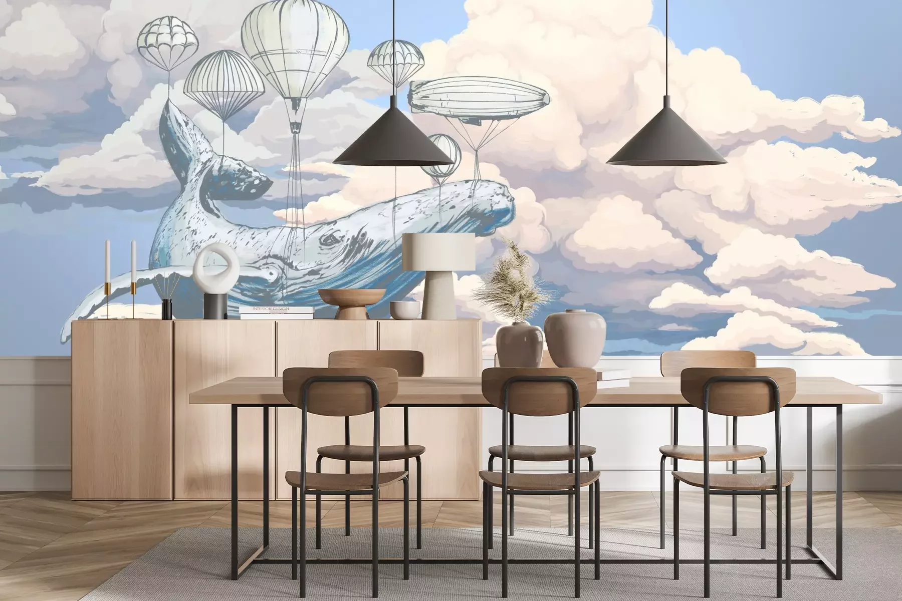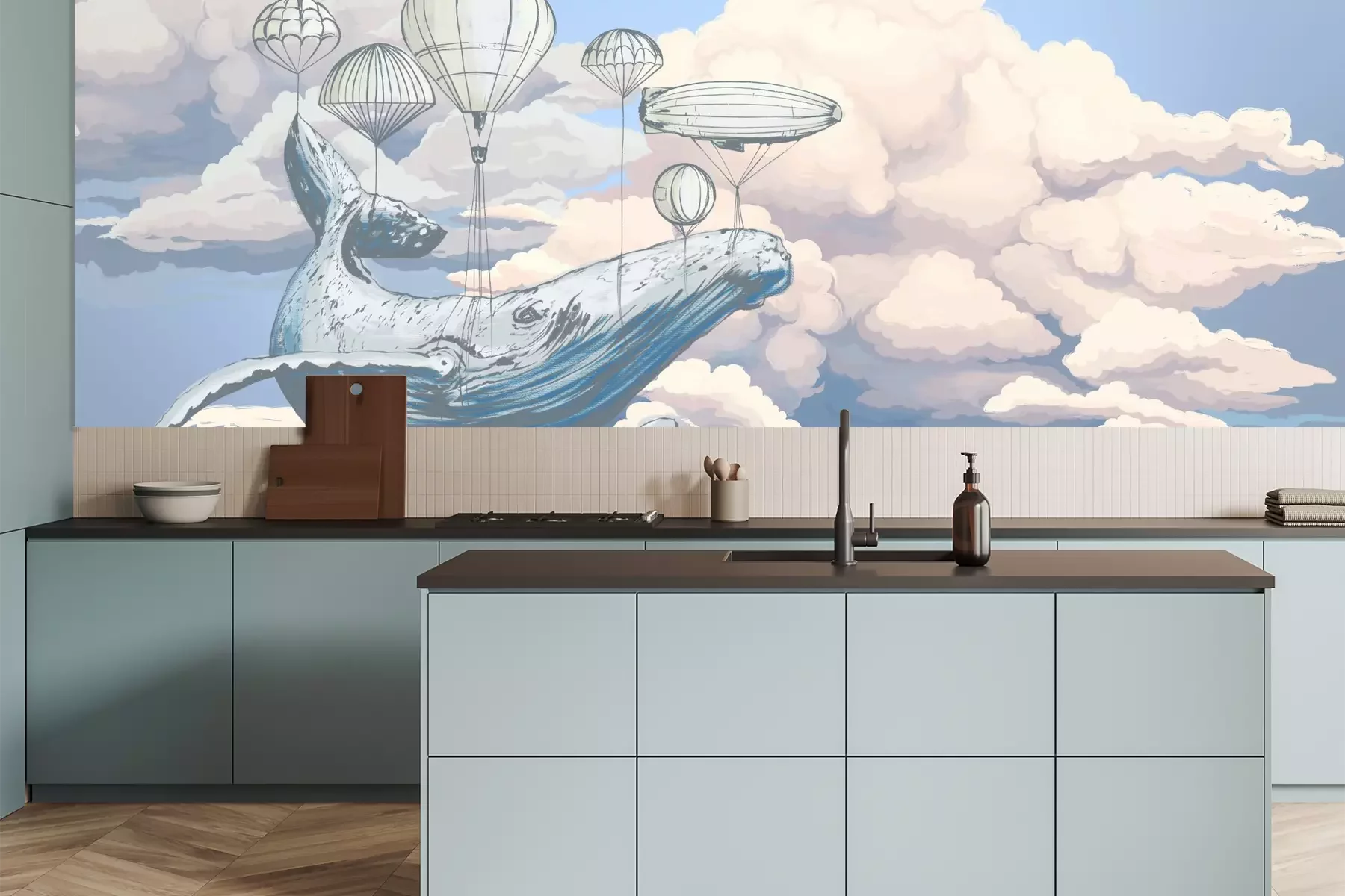 Aquarel walvis met ballonnen tussen blauwe wolken - kinderpatroon