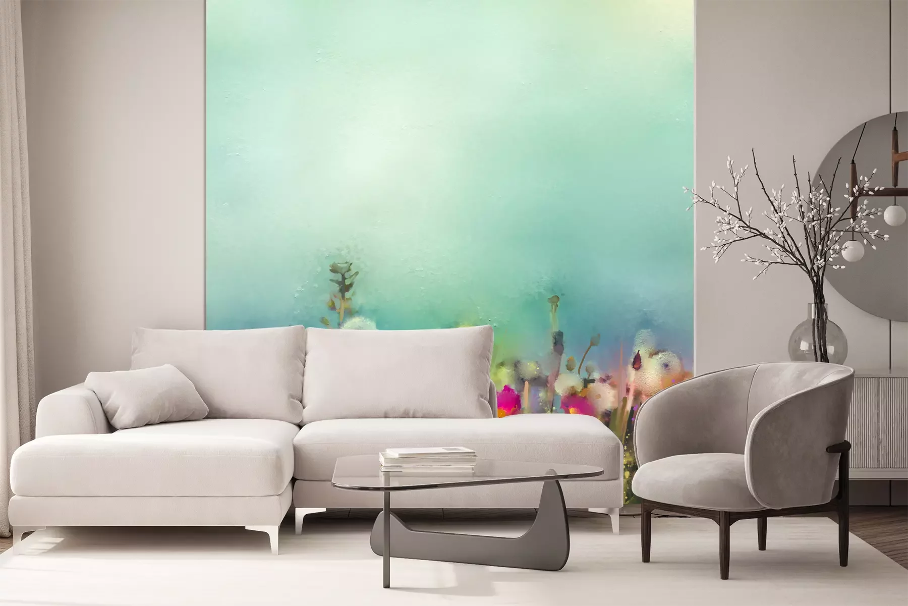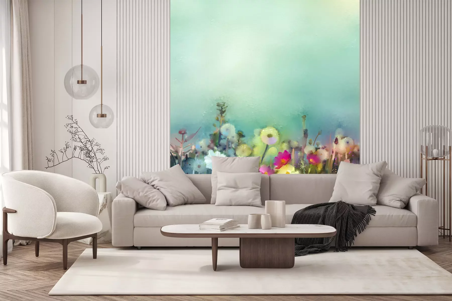Het materiaal Premium+ is een gestructureerd vinyl op vlies met een gewicht van 255 g/m², dat kleine oneffenheden in de muur effectief camoufleert. De subtiele structuur van fijn zand geeft het oppervlak een exclusieve uitstraling, terwijl de halfmatte afwerking de diepte van de kleuren benadrukt. Het materiaal is dampdoorlatend, waardoor het ook in de keuken en badkamer kan worden gebruikt. De maximale breedte van één baan bedraagt 100 cm – bij grotere afmetingen wordt het fotobehang in meerdere gelijke banen verdeeld. De lijm wordt direct op de muur aangebracht en het behang wordt rand-aan-rand geplakt, wat zorgt voor een esthetisch resultaat zonder zichtbare naden. Het oppervlak kan gemakkelijk worden schoongemaakt door het voorzichtig af te nemen met een vochtige doek.
