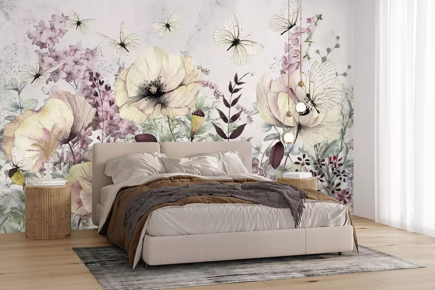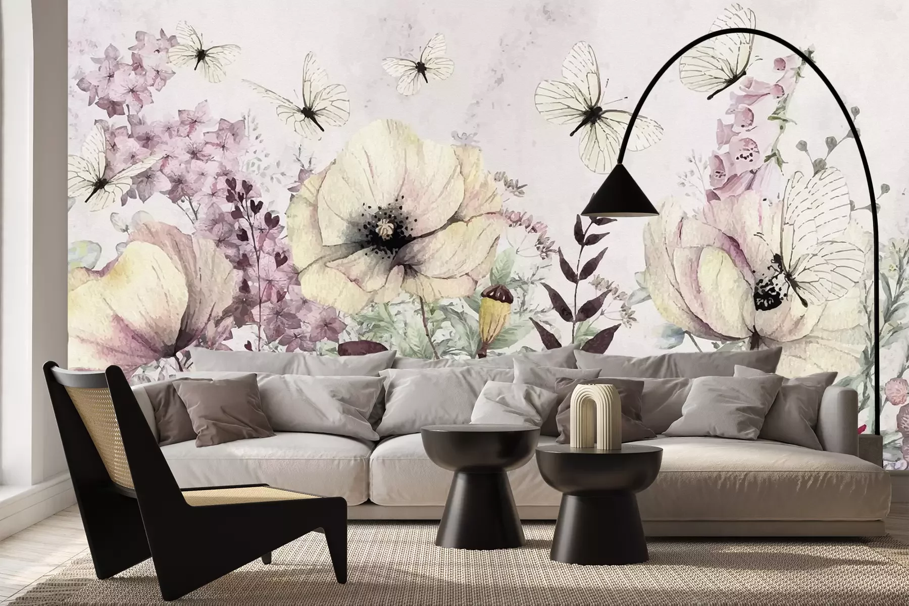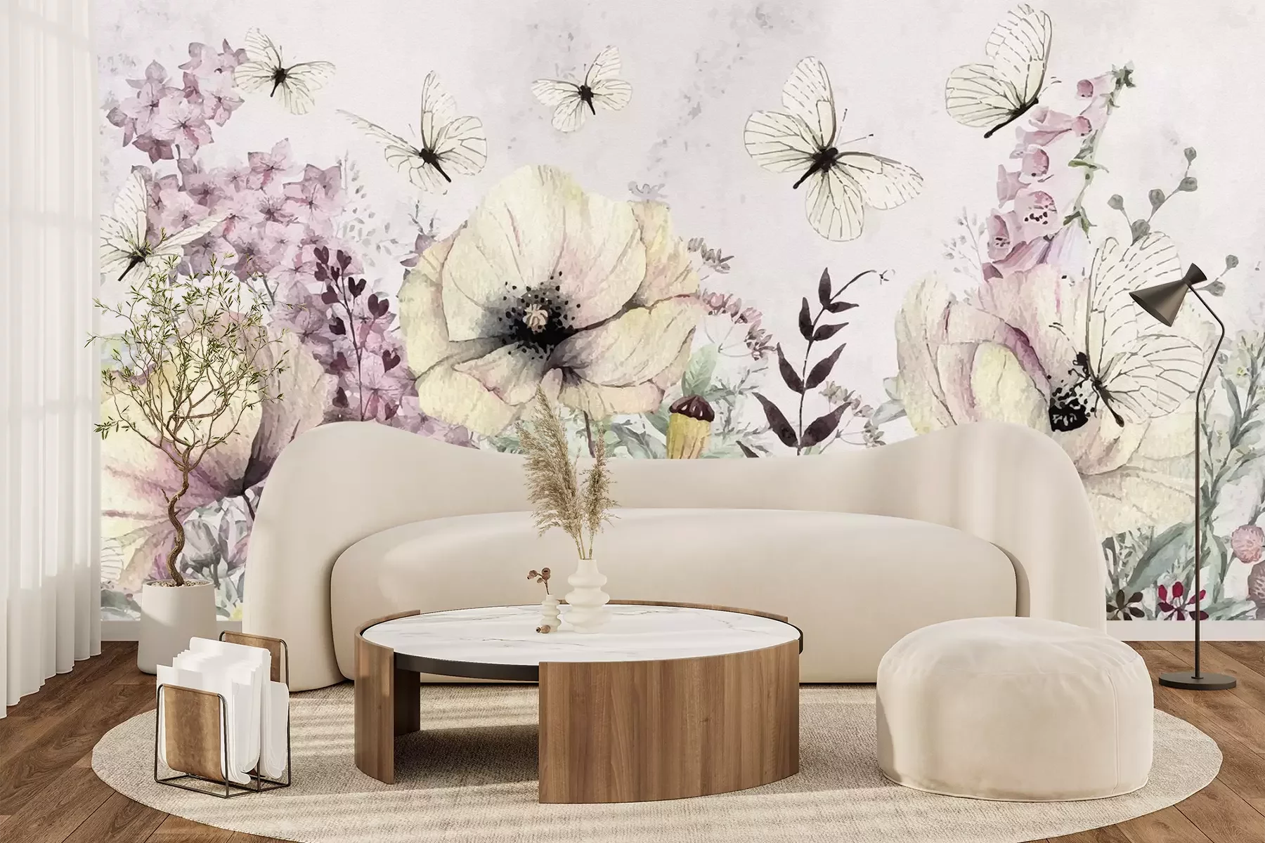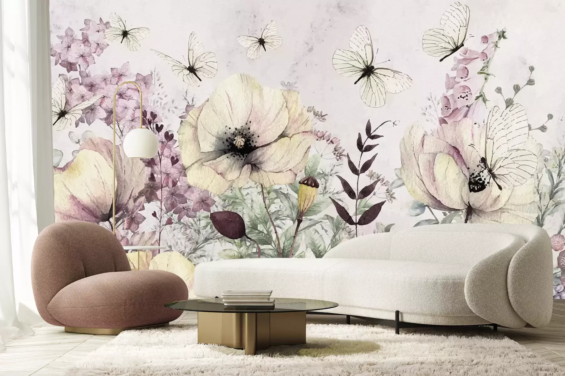 Aquarel weidebloemen en witte vlinders botanisch delicaat patroon