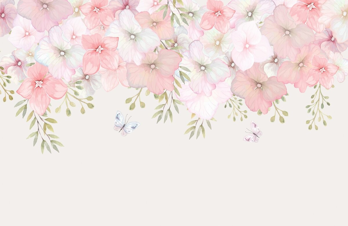 Fotobehang: Aquarelbloemen en vlinders in een pastelcompositie