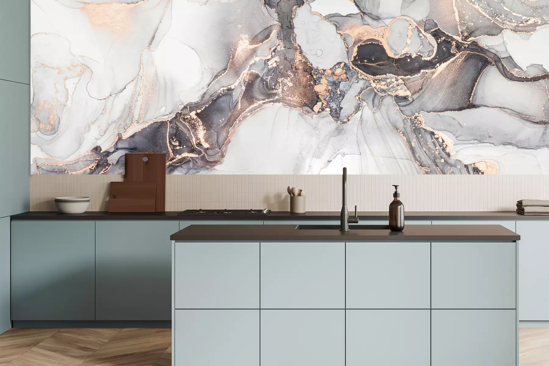 Het materiaal Premium is een glad vinyl op vlies, dat bestand is tegen uitrekken en vervorming. Het is dampdoorlatend – de muren kunnen vrij ademen – waardoor het geschikt is voor gebruik in de keuken en badkamer. Bij vervuiling kan het materiaal worden afgenomen met een vochtige doek. De maximale breedte van één baan bedraagt 95 of 105 cm, afhankelijk van de beschikbaarheid. Montage vindt plaats met de rand-aan-rand methode, wat een esthetisch resultaat zonder zichtbare naden oplevert. Omdat de lijm rechtstreeks op de muur wordt aangebracht, verloopt de installatie van het fotobehang snel en eenvoudig.