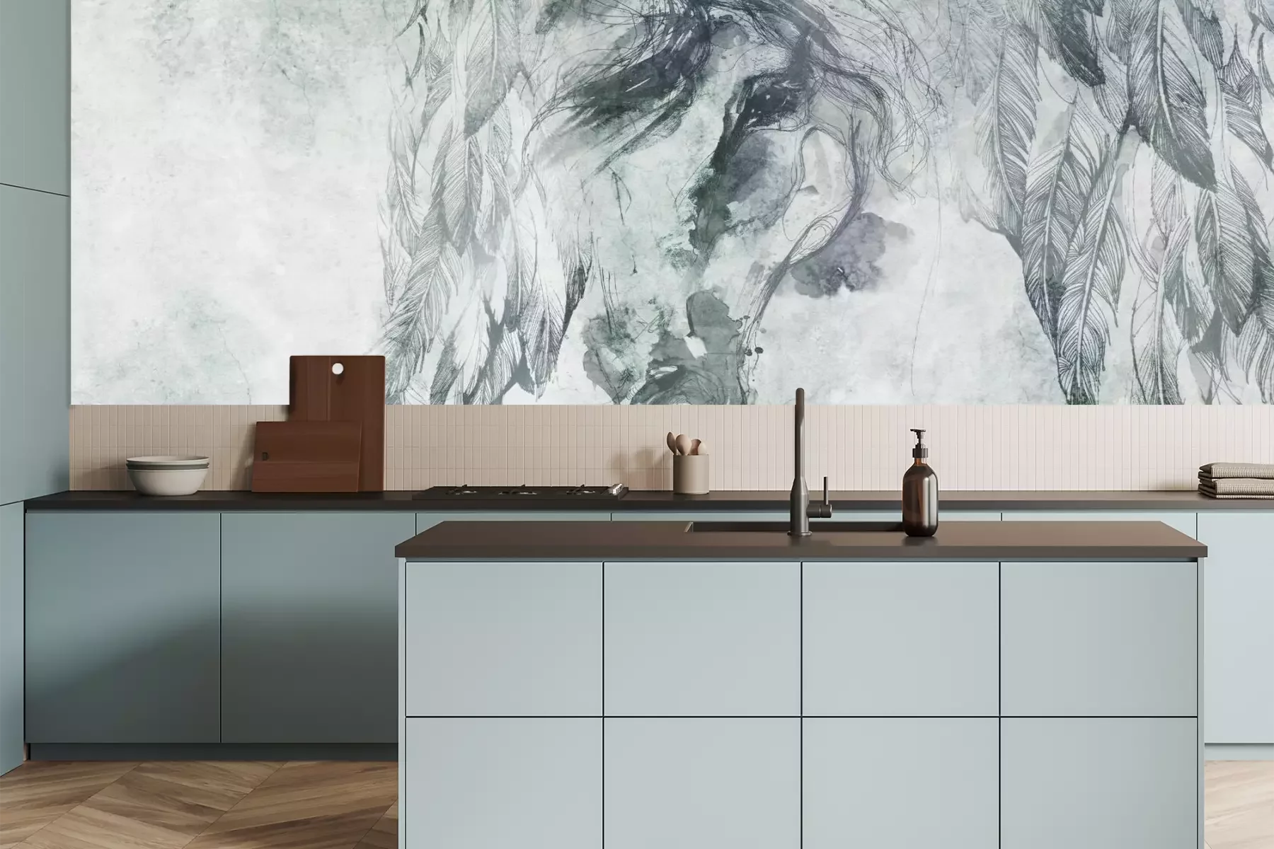 Het materiaal Premium+ is een gestructureerd vinyl op vlies met een gewicht van 255 g/m², dat kleine oneffenheden in de muur effectief camoufleert. De subtiele structuur van fijn zand geeft het oppervlak een exclusieve uitstraling, terwijl de halfmatte afwerking de diepte van de kleuren benadrukt. Het materiaal is dampdoorlatend, waardoor het ook in de keuken en badkamer kan worden gebruikt. De maximale breedte van één baan bedraagt 100 cm – bij grotere afmetingen wordt het fotobehang in meerdere gelijke banen verdeeld. De lijm wordt direct op de muur aangebracht en het behang wordt rand-aan-rand geplakt, wat zorgt voor een esthetisch resultaat zonder zichtbare naden. Het oppervlak kan gemakkelijk worden schoongemaakt door het voorzichtig af te nemen met een vochtige doek.