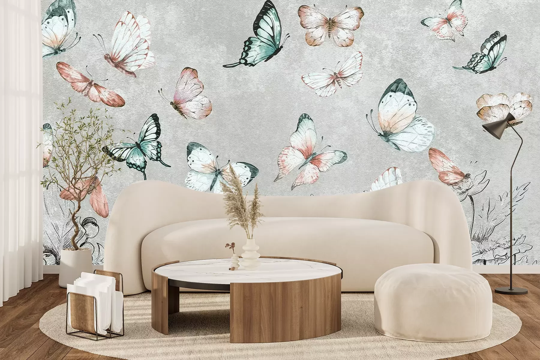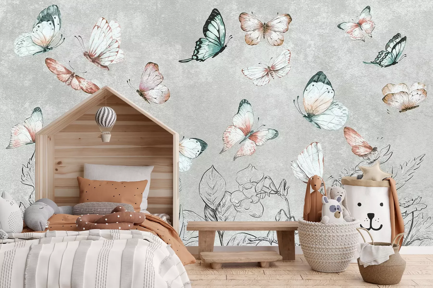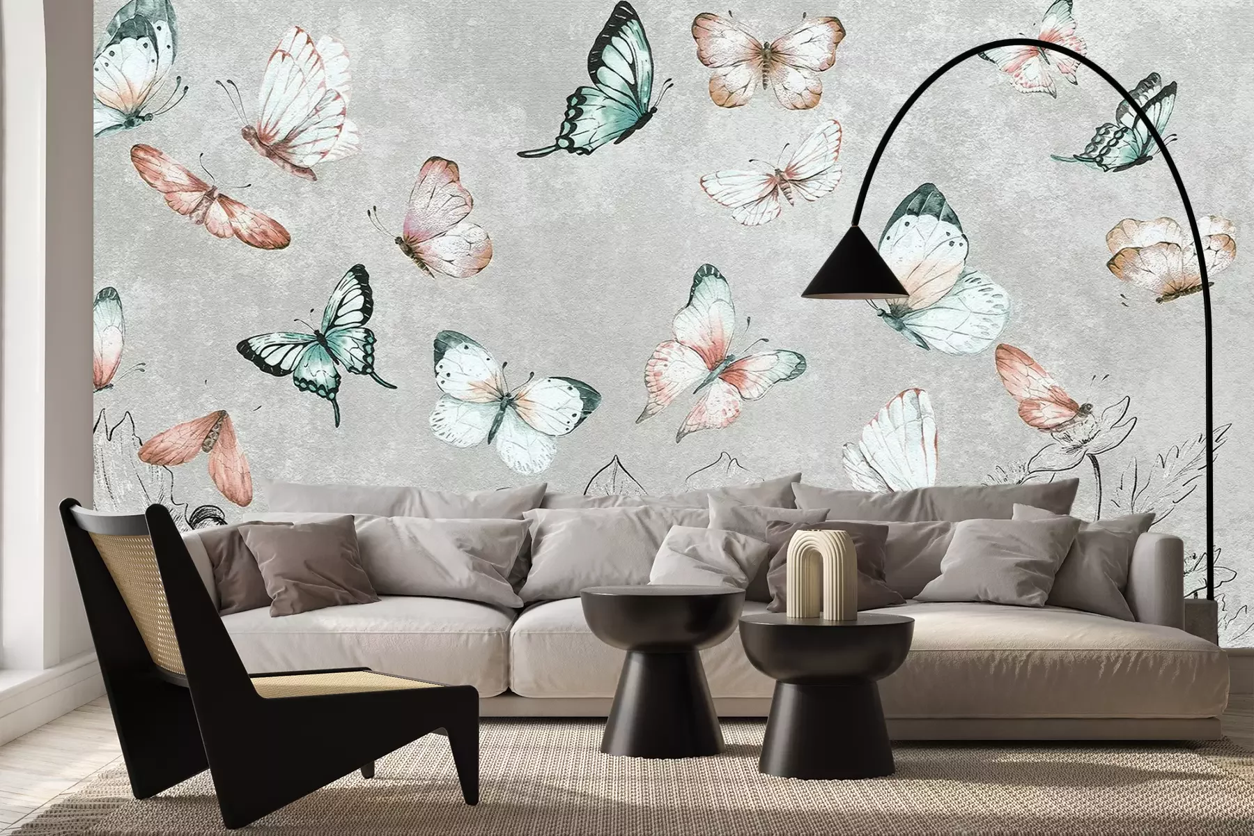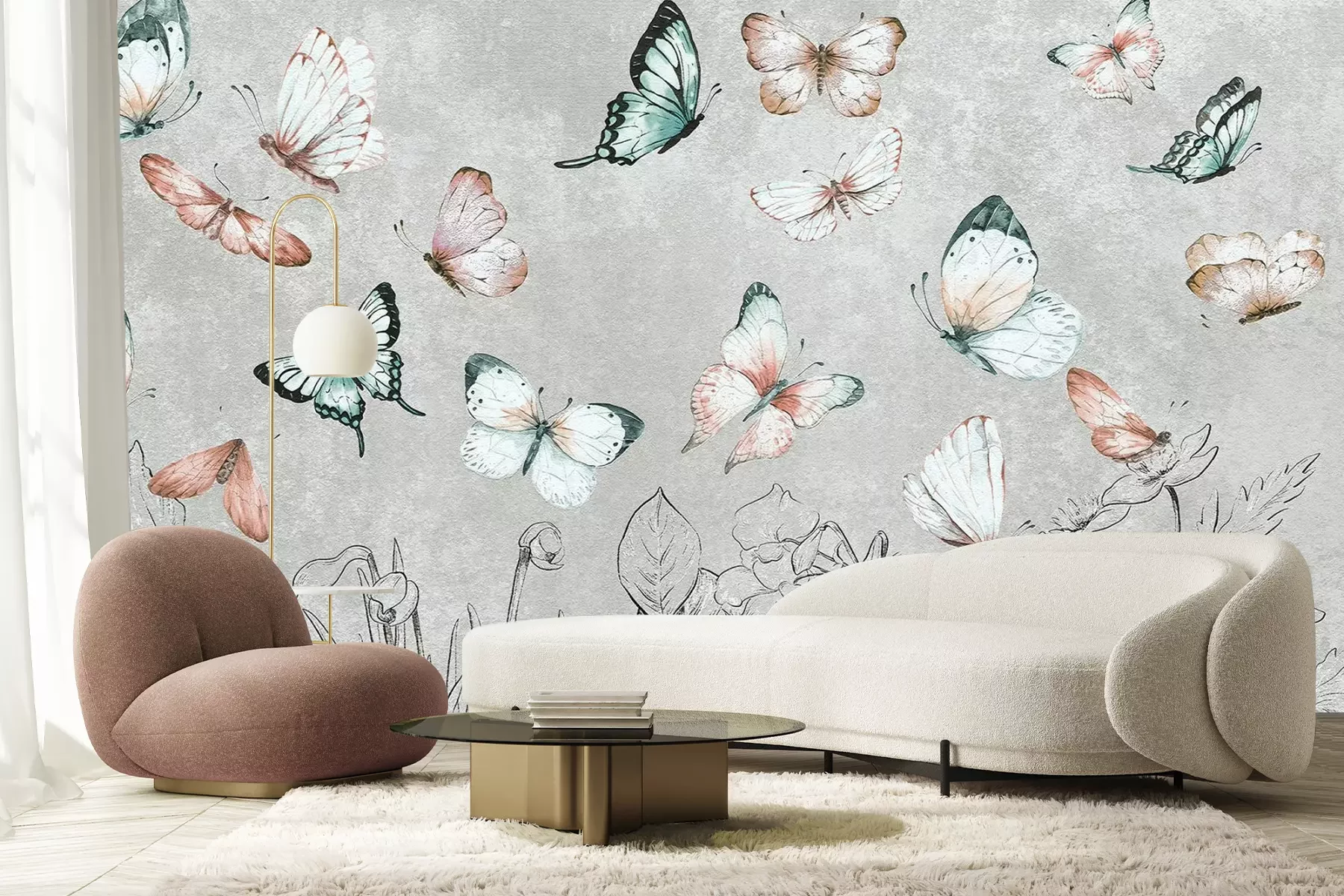 Aquarelpatroon van vlinders, motten en planten op een grijze achtergrond
