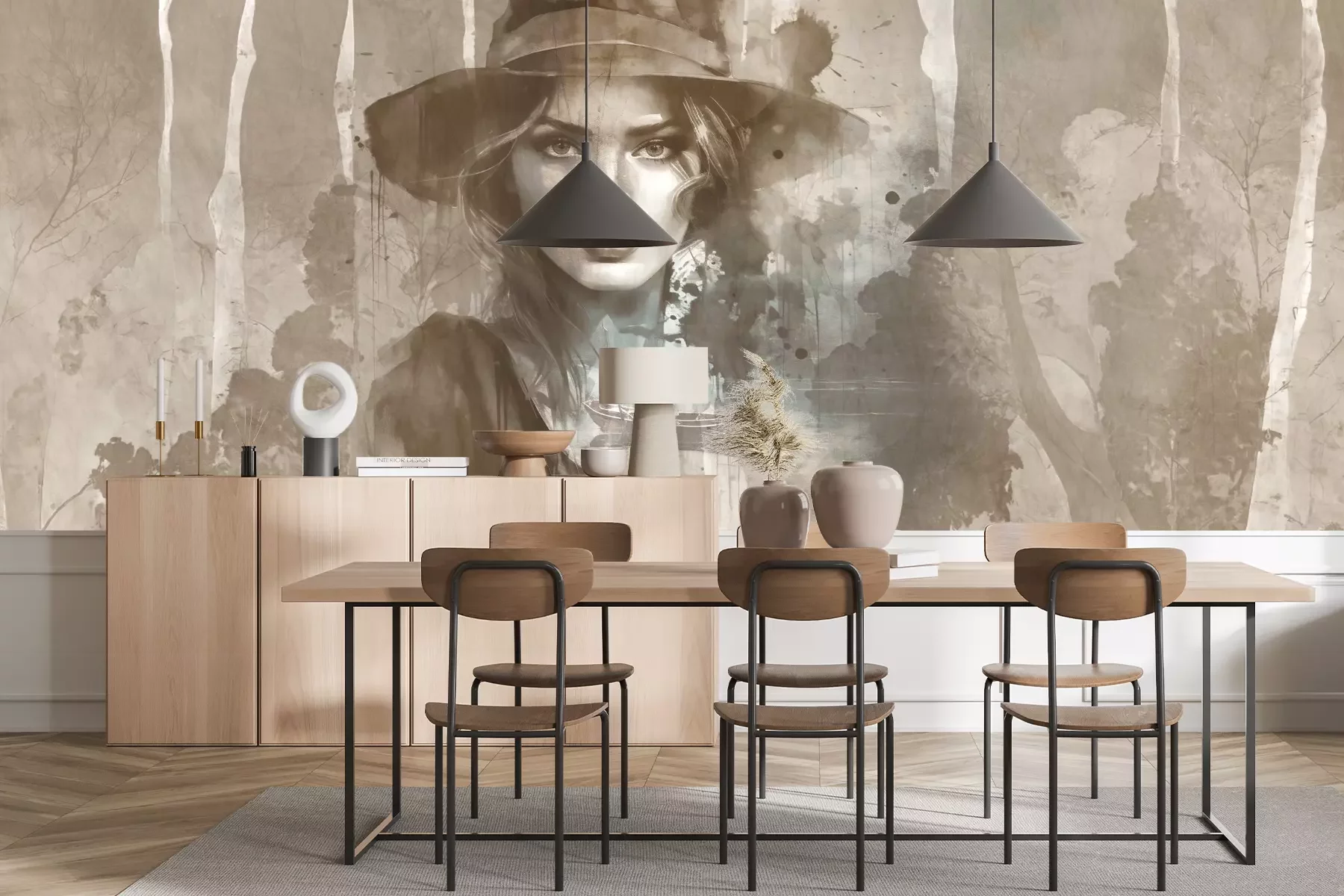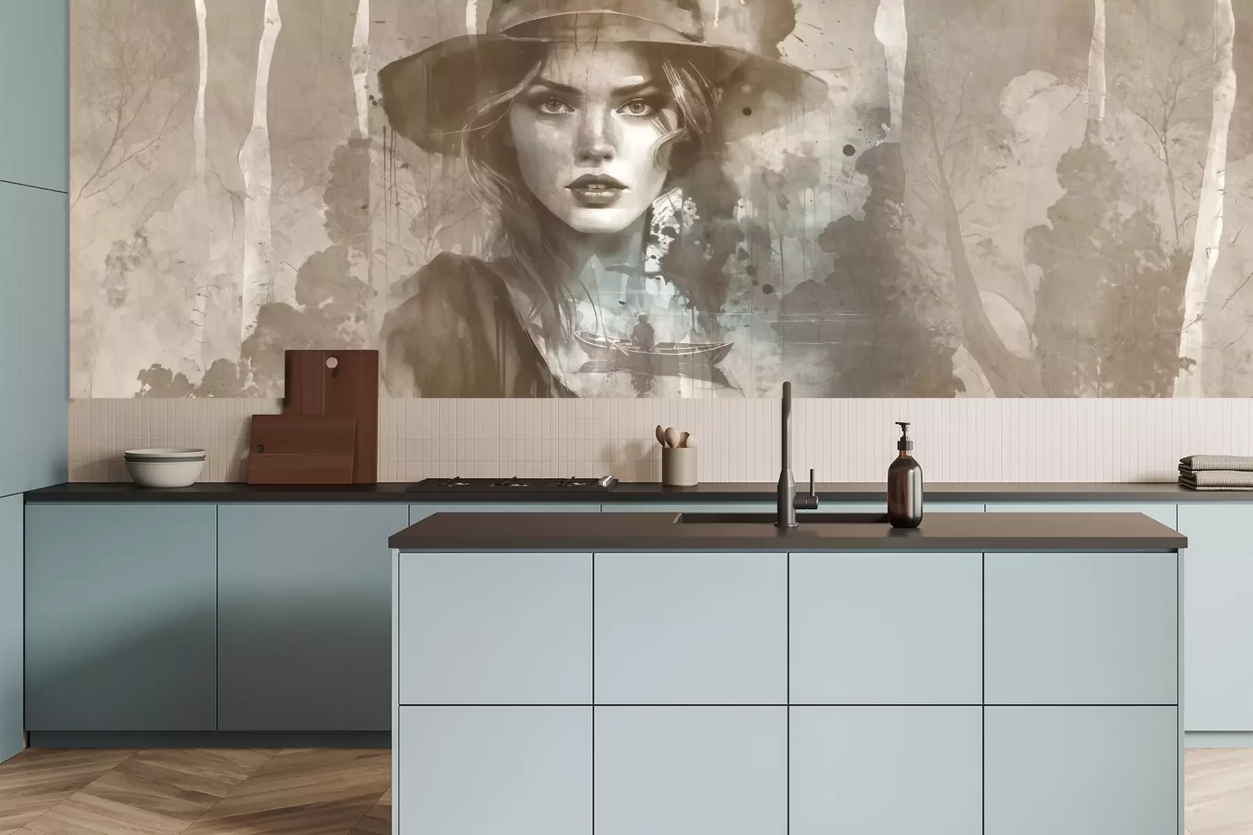 Aquarelportret van een vrouw met een hoed met bomen op de achtergrond