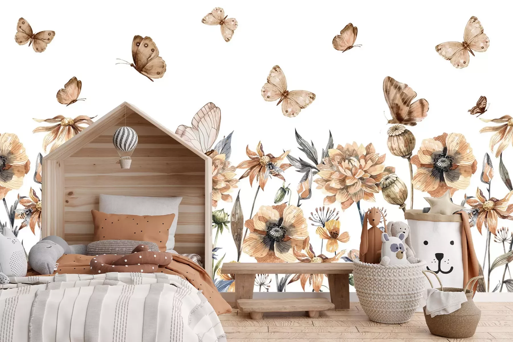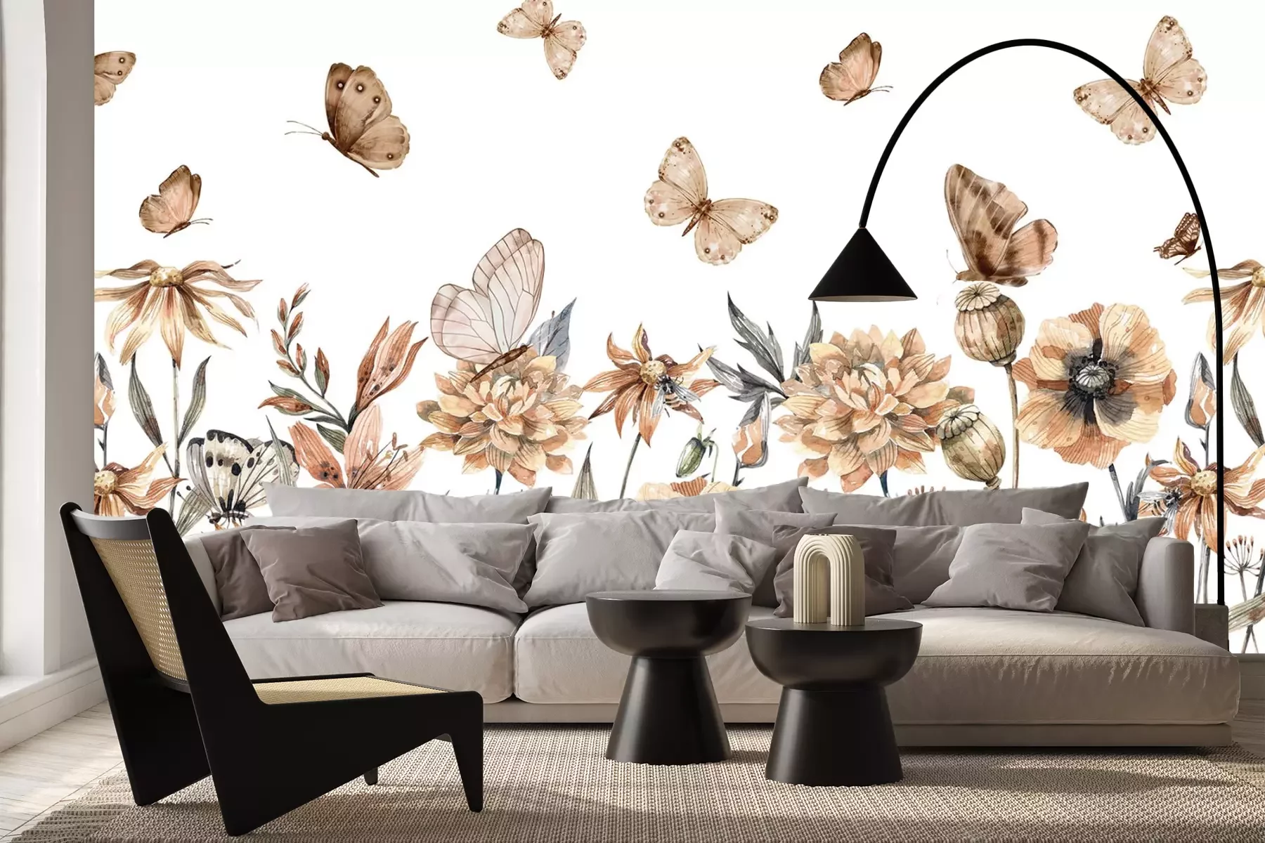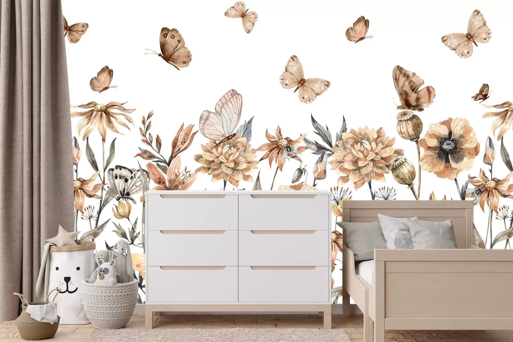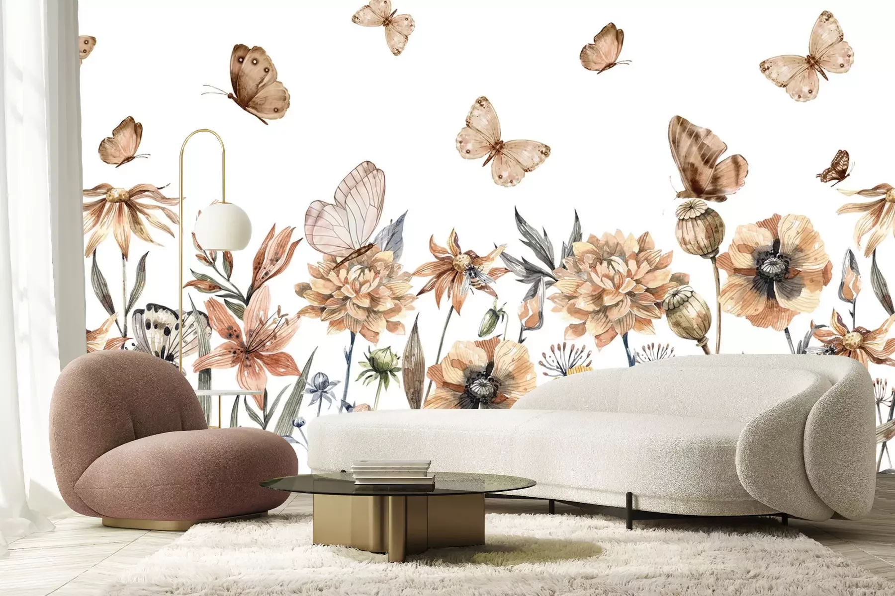 Aquarelweide met bloemen en vlinders op een witte achtergrond, botanisch patroon