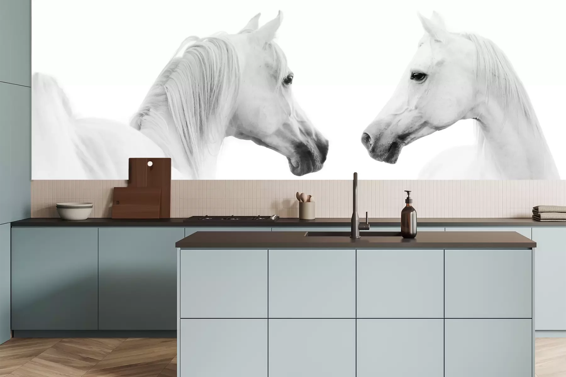 Het materiaal Premium is een glad vinyl op vlies, dat bestand is tegen uitrekken en vervorming. Het is dampdoorlatend – de muren kunnen vrij ademen – waardoor het geschikt is voor gebruik in de keuken en badkamer. Bij vervuiling kan het materiaal worden afgenomen met een vochtige doek. De maximale breedte van één baan bedraagt 95 of 105 cm, afhankelijk van de beschikbaarheid. Montage vindt plaats met de rand-aan-rand methode, wat een esthetisch resultaat zonder zichtbare naden oplevert. Omdat de lijm rechtstreeks op de muur wordt aangebracht, verloopt de installatie van het fotobehang snel en eenvoudig.