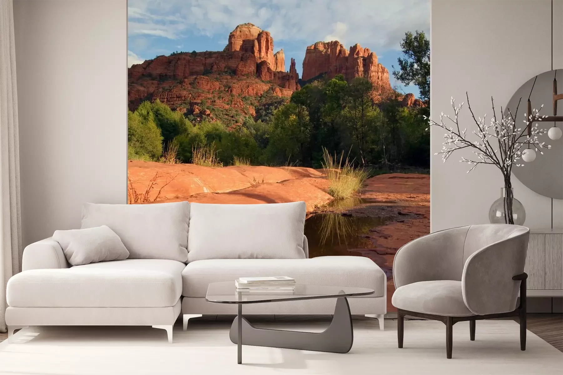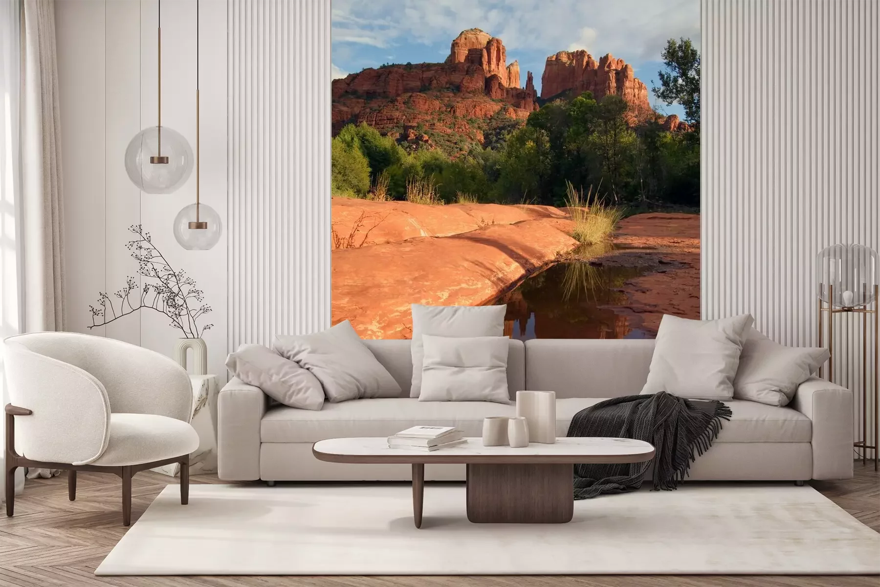 Het materiaal Premium+ is een gestructureerd vinyl op vlies met een gewicht van 255 g/m², dat kleine oneffenheden in de muur effectief camoufleert. De subtiele structuur van fijn zand geeft het oppervlak een exclusieve uitstraling, terwijl de halfmatte afwerking de diepte van de kleuren benadrukt. Het materiaal is dampdoorlatend, waardoor het ook in de keuken en badkamer kan worden gebruikt. De maximale breedte van één baan bedraagt 100 cm – bij grotere afmetingen wordt het fotobehang in meerdere gelijke banen verdeeld. De lijm wordt direct op de muur aangebracht en het behang wordt rand-aan-rand geplakt, wat zorgt voor een esthetisch resultaat zonder zichtbare naden. Het oppervlak kan gemakkelijk worden schoongemaakt door het voorzichtig af te nemen met een vochtige doek.