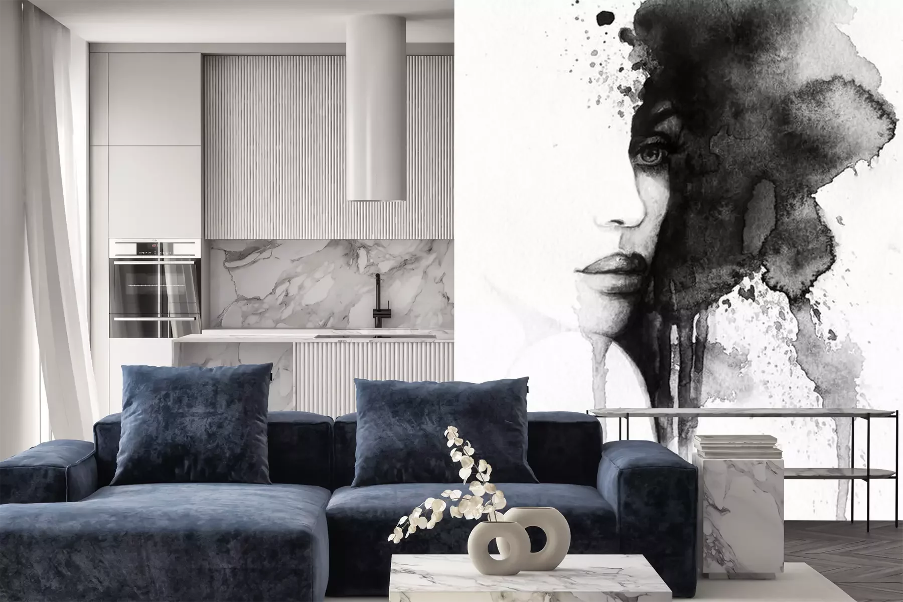 Het materiaal Premium is een glad vinyl op vlies, dat bestand is tegen uitrekken en vervorming. Het is dampdoorlatend – de muren kunnen vrij ademen – waardoor het geschikt is voor gebruik in de keuken en badkamer. Bij vervuiling kan het materiaal worden afgenomen met een vochtige doek. De maximale breedte van één baan bedraagt 95 of 105 cm, afhankelijk van de beschikbaarheid. Montage vindt plaats met de rand-aan-rand methode, wat een esthetisch resultaat zonder zichtbare naden oplevert. Omdat de lijm rechtstreeks op de muur wordt aangebracht, verloopt de installatie van het fotobehang snel en eenvoudig.