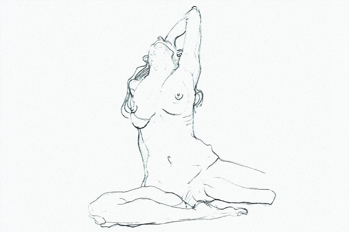 Artistieke schets van een vrouwenfiguur op een lichte achtergrond