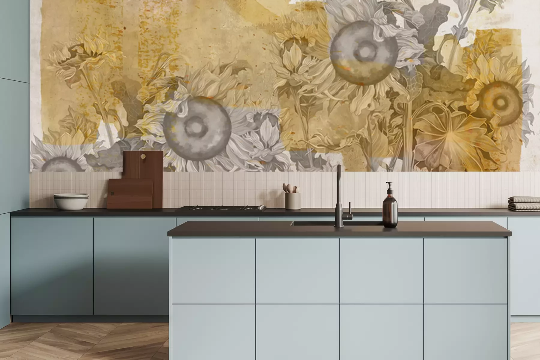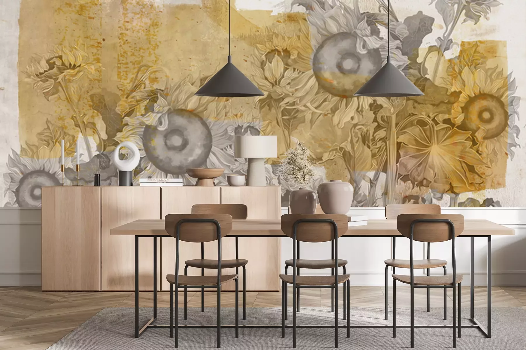 Fotobehang Artistieke zonnebloemen op concrete textuur