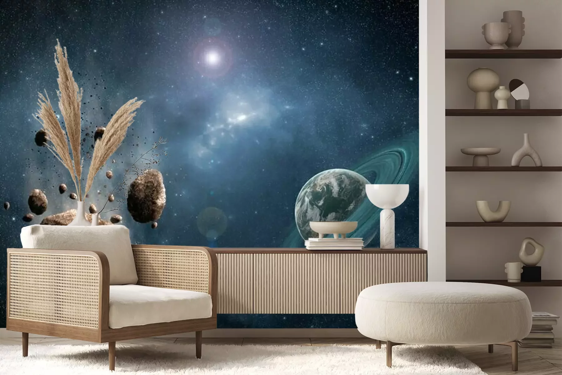 Het materiaal Premium+ is een gestructureerd vinyl op vlies met een gewicht van 255 g/m², dat kleine oneffenheden in de muur effectief camoufleert. De subtiele structuur van fijn zand geeft het oppervlak een exclusieve uitstraling, terwijl de halfmatte afwerking de diepte van de kleuren benadrukt. Het materiaal is dampdoorlatend, waardoor het ook in de keuken en badkamer kan worden gebruikt. De maximale breedte van één baan bedraagt 100 cm – bij grotere afmetingen wordt het fotobehang in meerdere gelijke banen verdeeld. De lijm wordt direct op de muur aangebracht en het behang wordt rand-aan-rand geplakt, wat zorgt voor een esthetisch resultaat zonder zichtbare naden. Het oppervlak kan gemakkelijk worden schoongemaakt door het voorzichtig af te nemen met een vochtige doek.