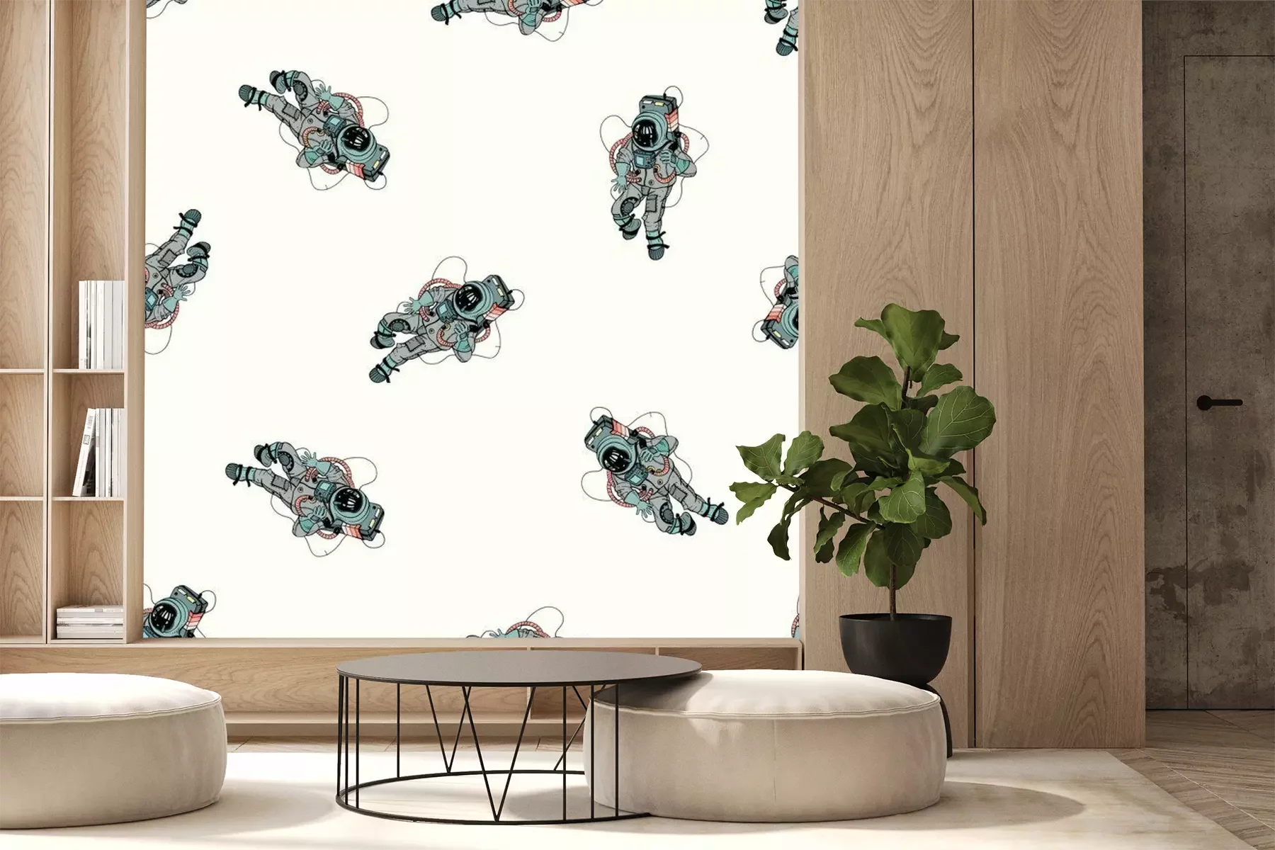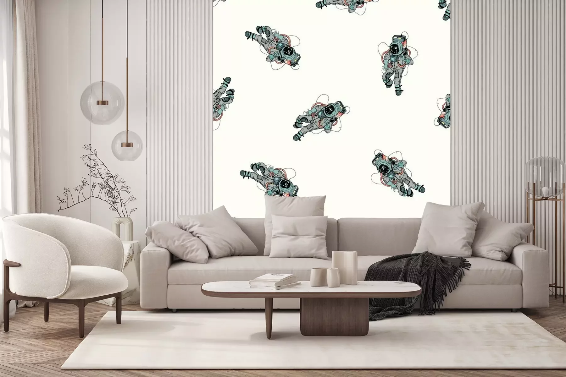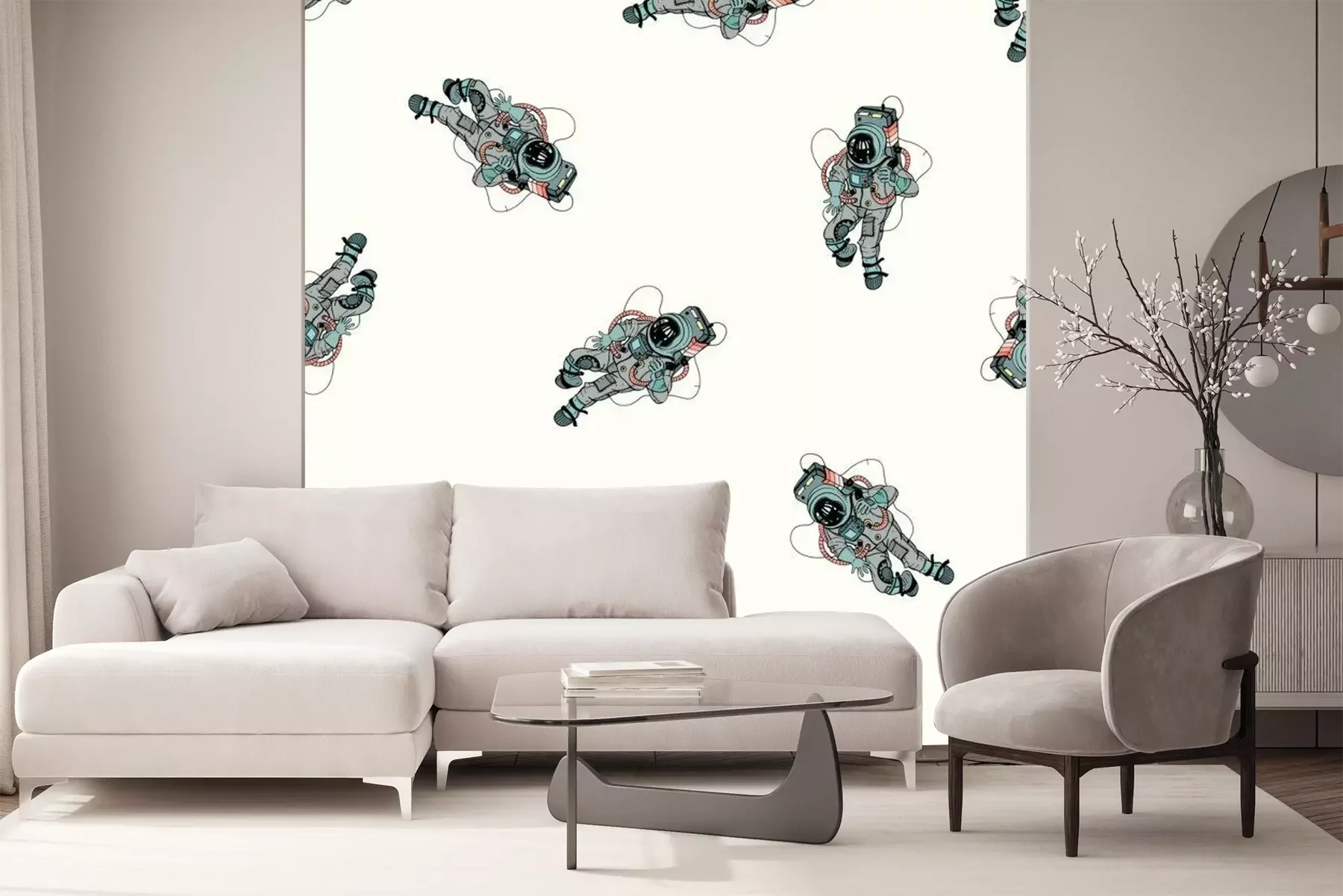 Fotobehang Astronaut in ruimtepak naadloos patroon. Cosmonaut in de ruimte op een witte achtergrond. Kleurrijke vector illustratie.