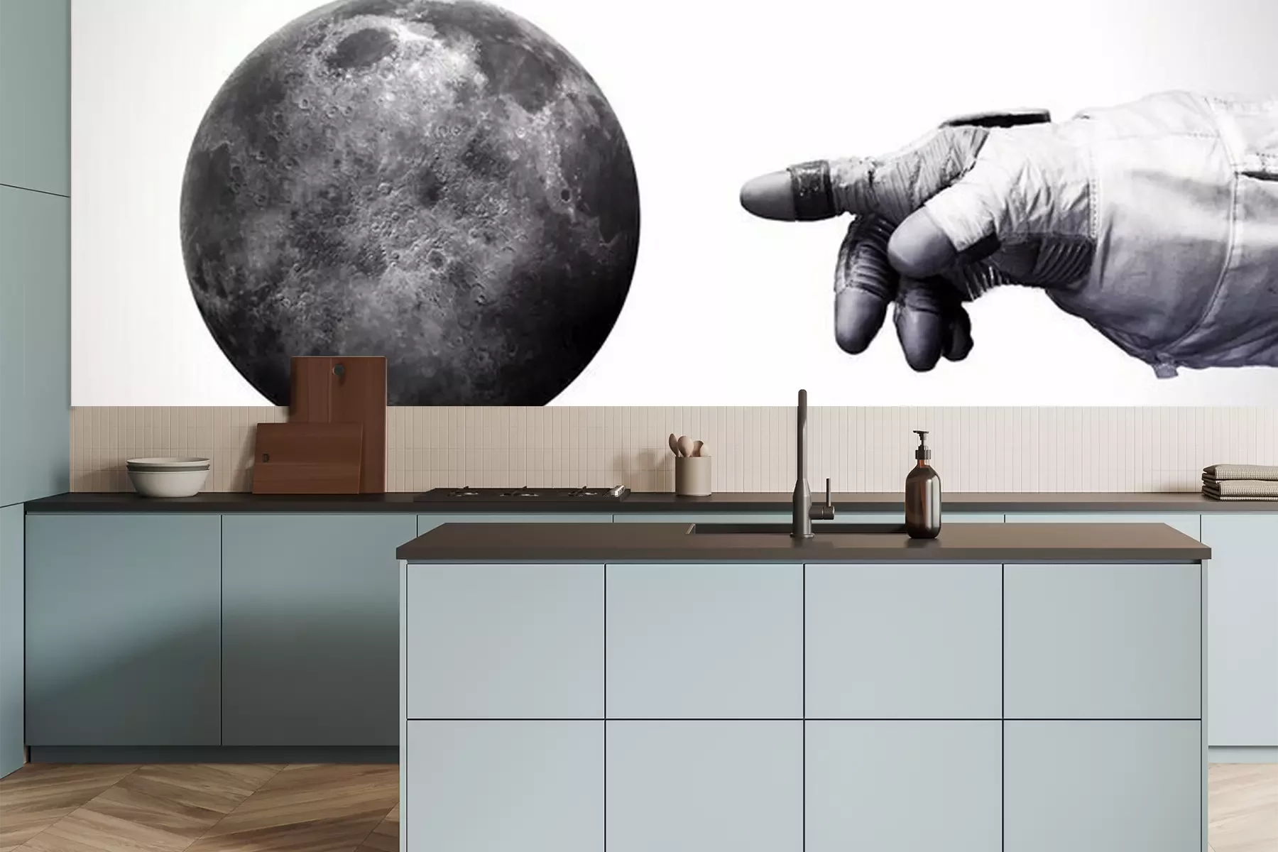Het materiaal Premium is een glad vinyl op vlies, dat bestand is tegen uitrekken en vervorming. Het is dampdoorlatend – de muren kunnen vrij ademen – waardoor het geschikt is voor gebruik in de keuken en badkamer. Bij vervuiling kan het materiaal worden afgenomen met een vochtige doek. De maximale breedte van één baan bedraagt 95 of 105 cm, afhankelijk van de beschikbaarheid. Montage vindt plaats met de rand-aan-rand methode, wat een esthetisch resultaat zonder zichtbare naden oplevert. Omdat de lijm rechtstreeks op de muur wordt aangebracht, verloopt de installatie van het fotobehang snel en eenvoudig.