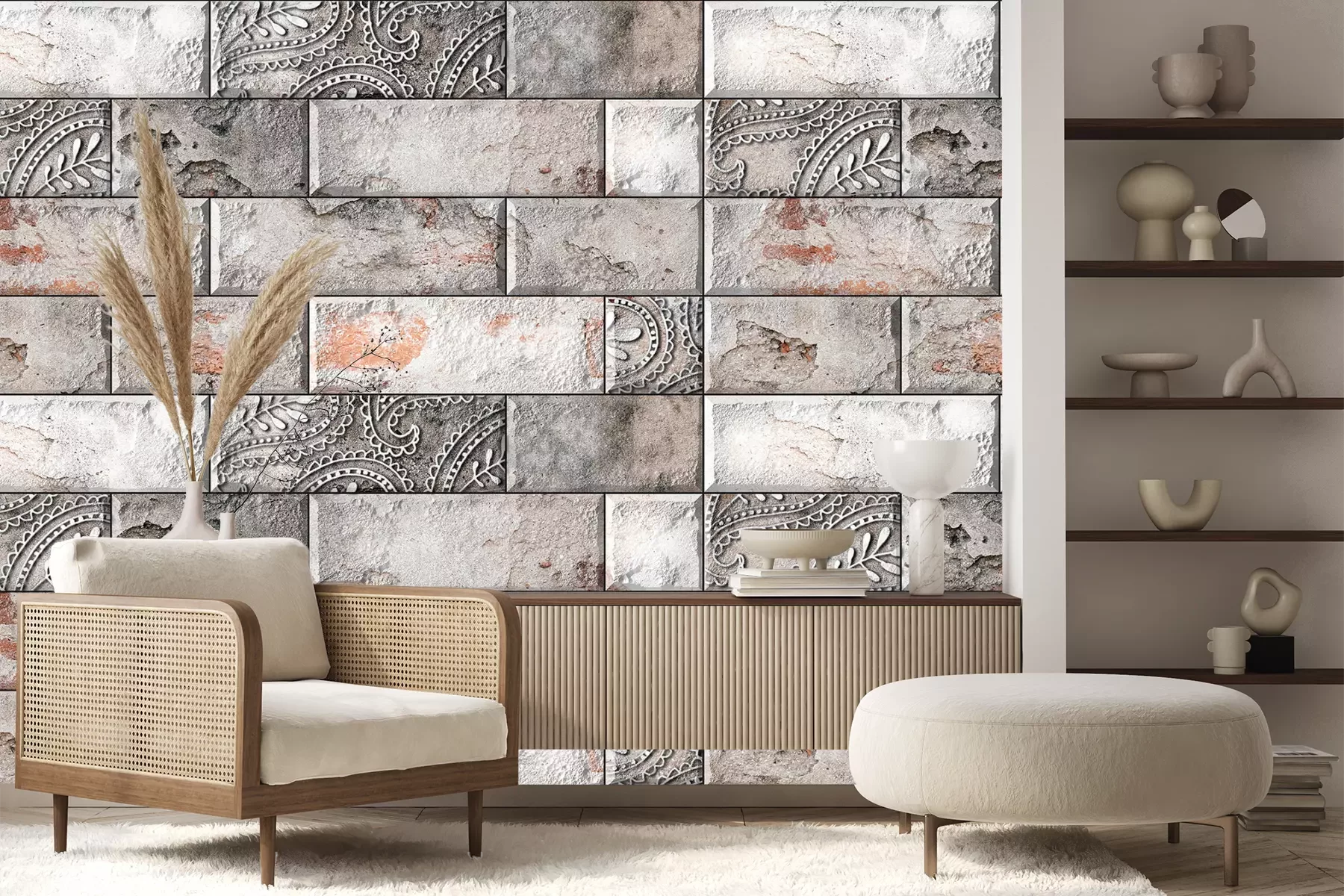 Het materiaal Premium+ is een gestructureerd vinyl op vlies met een gewicht van 255 g/m², dat kleine oneffenheden in de muur effectief camoufleert. De subtiele structuur van fijn zand geeft het oppervlak een exclusieve uitstraling, terwijl de halfmatte afwerking de diepte van de kleuren benadrukt. Het materiaal is dampdoorlatend, waardoor het ook in de keuken en badkamer kan worden gebruikt. De maximale breedte van één baan bedraagt 100 cm – bij grotere afmetingen wordt het fotobehang in meerdere gelijke banen verdeeld. De lijm wordt direct op de muur aangebracht en het behang wordt rand-aan-rand geplakt, wat zorgt voor een esthetisch resultaat zonder zichtbare naden. Het oppervlak kan gemakkelijk worden schoongemaakt door het voorzichtig af te nemen met een vochtige doek.