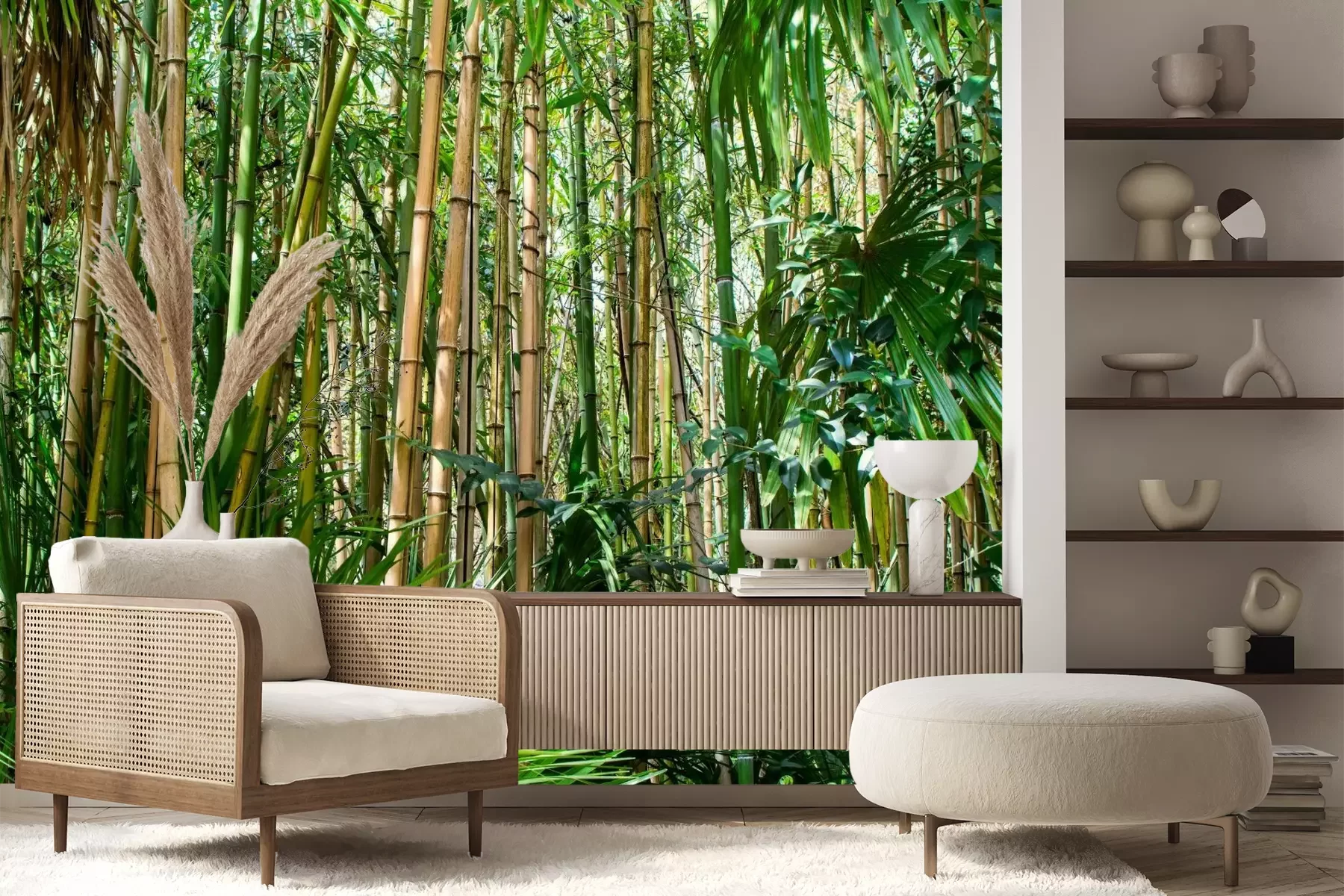Het materiaal Premium+ is een gestructureerd vinyl op vlies met een gewicht van 255 g/m², dat kleine oneffenheden in de muur effectief camoufleert. De subtiele structuur van fijn zand geeft het oppervlak een exclusieve uitstraling, terwijl de halfmatte afwerking de diepte van de kleuren benadrukt. Het materiaal is dampdoorlatend, waardoor het ook in de keuken en badkamer kan worden gebruikt. De maximale breedte van één baan bedraagt 100 cm – bij grotere afmetingen wordt het fotobehang in meerdere gelijke banen verdeeld. De lijm wordt direct op de muur aangebracht en het behang wordt rand-aan-rand geplakt, wat zorgt voor een esthetisch resultaat zonder zichtbare naden. Het oppervlak kan gemakkelijk worden schoongemaakt door het voorzichtig af te nemen met een vochtige doek.