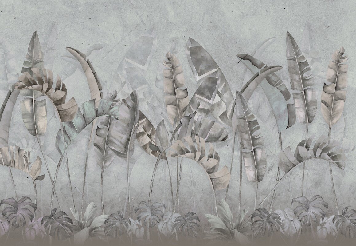 Fotobehang: Bananen- en monsterabladeren op een betonnen achtergrond