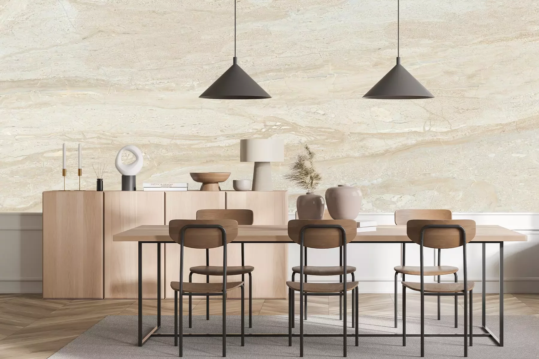 Het materiaal Premium+ is een gestructureerd vinyl op vlies met een gewicht van 255 g/m², dat kleine oneffenheden in de muur effectief camoufleert. De subtiele structuur van fijn zand geeft het oppervlak een exclusieve uitstraling, terwijl de halfmatte afwerking de diepte van de kleuren benadrukt. Het materiaal is dampdoorlatend, waardoor het ook in de keuken en badkamer kan worden gebruikt. De maximale breedte van één baan bedraagt 100 cm – bij grotere afmetingen wordt het fotobehang in meerdere gelijke banen verdeeld. De lijm wordt direct op de muur aangebracht en het behang wordt rand-aan-rand geplakt, wat zorgt voor een esthetisch resultaat zonder zichtbare naden. Het oppervlak kan gemakkelijk worden schoongemaakt door het voorzichtig af te nemen met een vochtige doek.