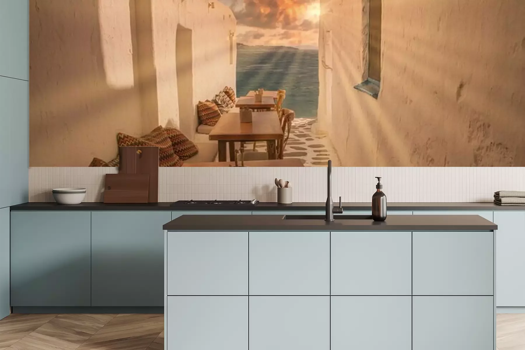 Het materiaal Premium is een glad vinyl op vlies, dat bestand is tegen uitrekken en vervorming. Het is dampdoorlatend – de muren kunnen vrij ademen – waardoor het geschikt is voor gebruik in de keuken en badkamer. Bij vervuiling kan het materiaal worden afgenomen met een vochtige doek. De maximale breedte van één baan bedraagt 95 of 105 cm, afhankelijk van de beschikbaarheid. Montage vindt plaats met de rand-aan-rand methode, wat een esthetisch resultaat zonder zichtbare naden oplevert. Omdat de lijm rechtstreeks op de muur wordt aangebracht, verloopt de installatie van het fotobehang snel en eenvoudig.