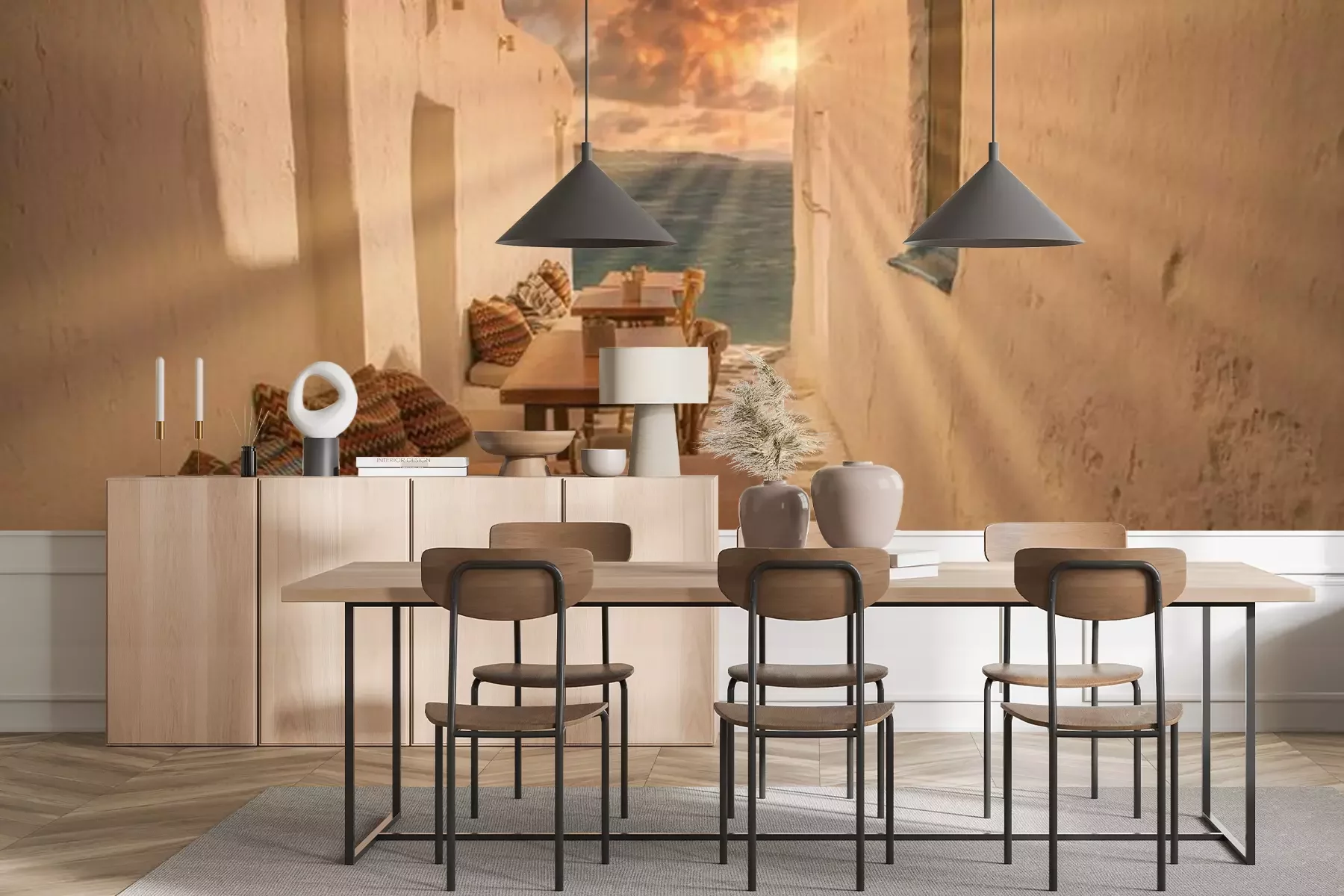 Het materiaal Premium+ is een gestructureerd vinyl op vlies met een gewicht van 255 g/m², dat kleine oneffenheden in de muur effectief camoufleert. De subtiele structuur van fijn zand geeft het oppervlak een exclusieve uitstraling, terwijl de halfmatte afwerking de diepte van de kleuren benadrukt. Het materiaal is dampdoorlatend, waardoor het ook in de keuken en badkamer kan worden gebruikt. De maximale breedte van één baan bedraagt 100 cm – bij grotere afmetingen wordt het fotobehang in meerdere gelijke banen verdeeld. De lijm wordt direct op de muur aangebracht en het behang wordt rand-aan-rand geplakt, wat zorgt voor een esthetisch resultaat zonder zichtbare naden. Het oppervlak kan gemakkelijk worden schoongemaakt door het voorzichtig af te nemen met een vochtige doek.